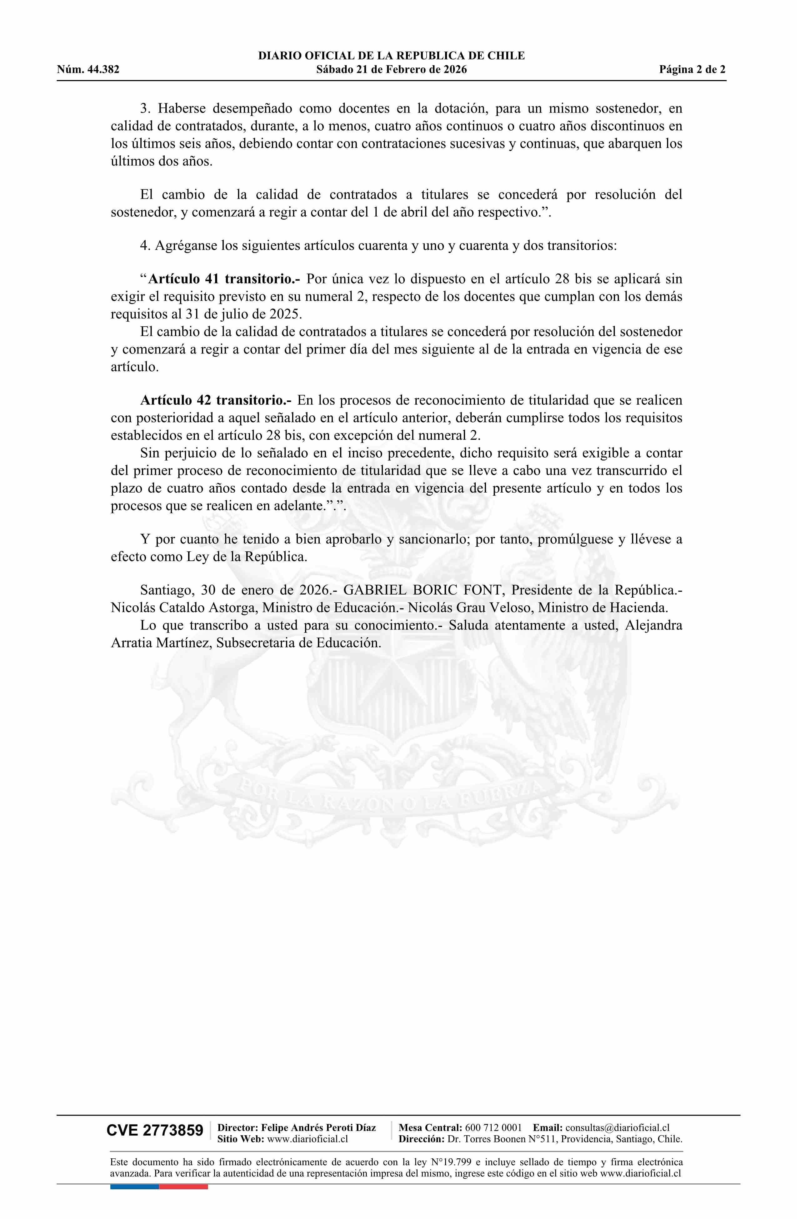 Ley número 21.803.- Establece los requisitos para otorgar la calidad de titular a los profesionales de la educación parvularia, básica o media