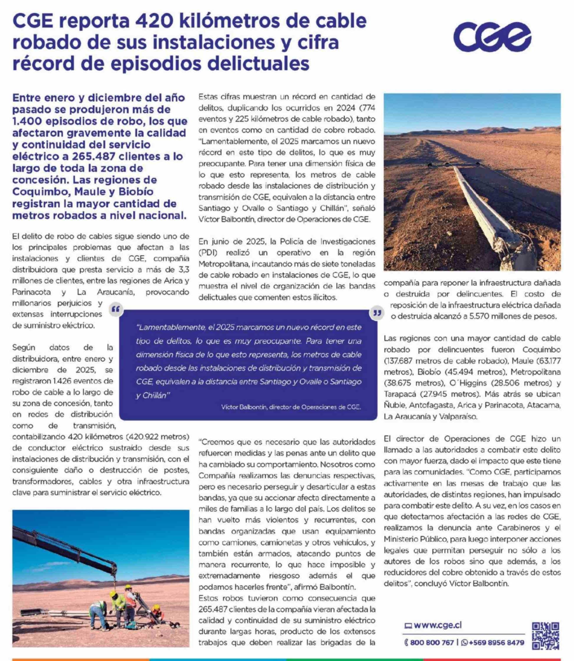 CGE reporta 420 kilómetros de cable robado de sus instalaciones y cifra récord de episodios delictuales 10-02-2026 La Estrella de Iquique |