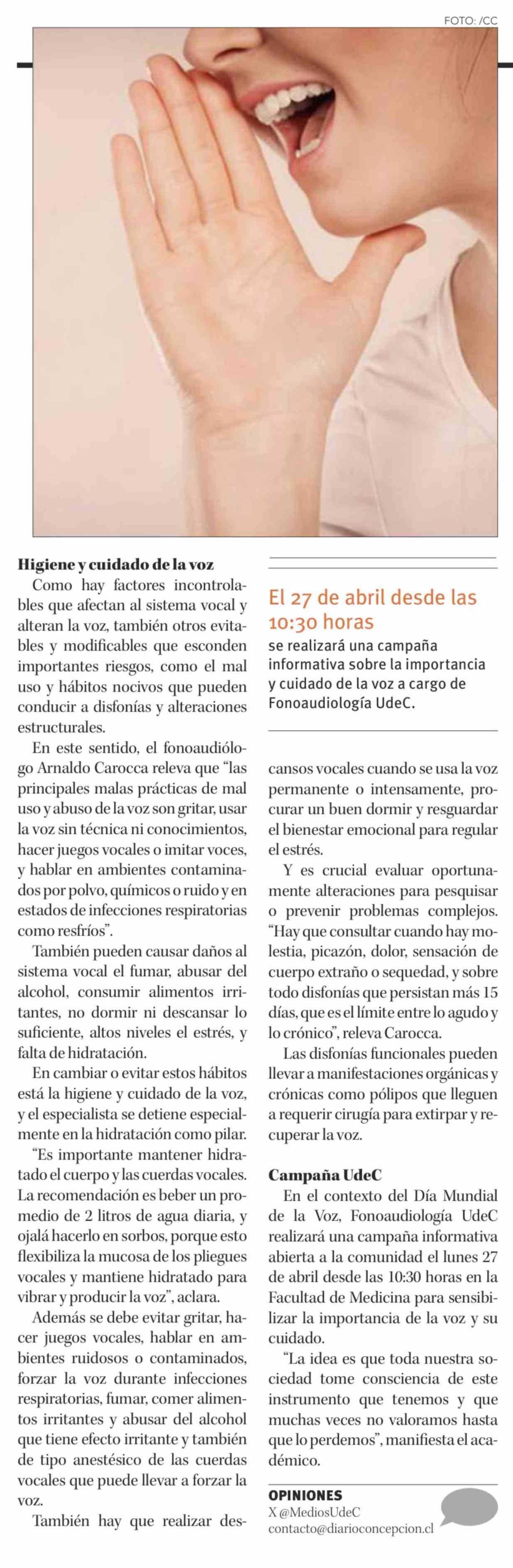 Salud vocal: los hábitos pueden cuidar o alterar al instrumento natural de comunicación e identidad 16-04-2026 Diario Concepción |