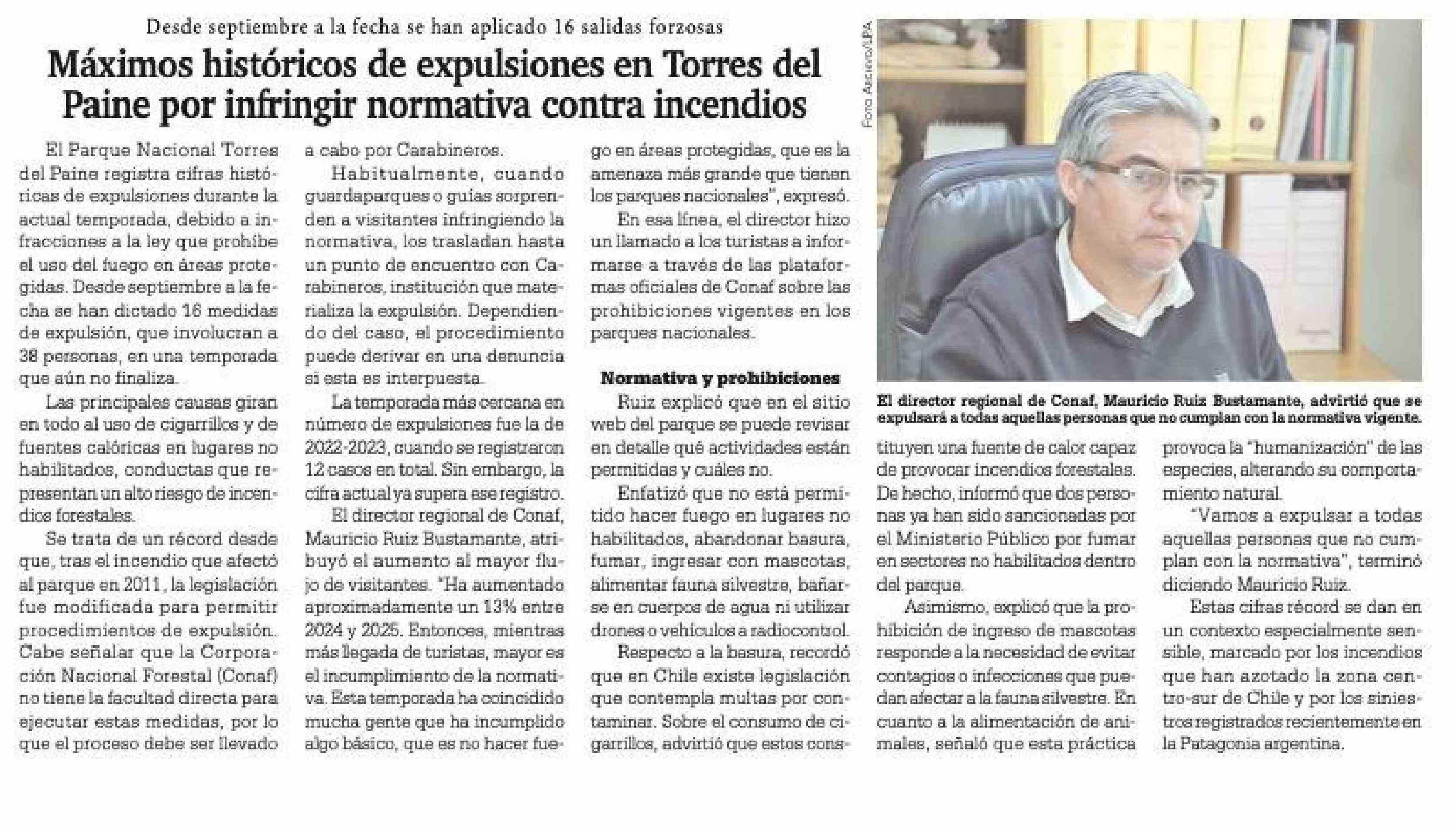 Desde septiembre a la fecha se han aplicado 16 salidas forzosas Máximos históricos de expulsiones en Torres del Paine por infringir normativa contra incendios 12-02-2026 La Prensa Austral |
