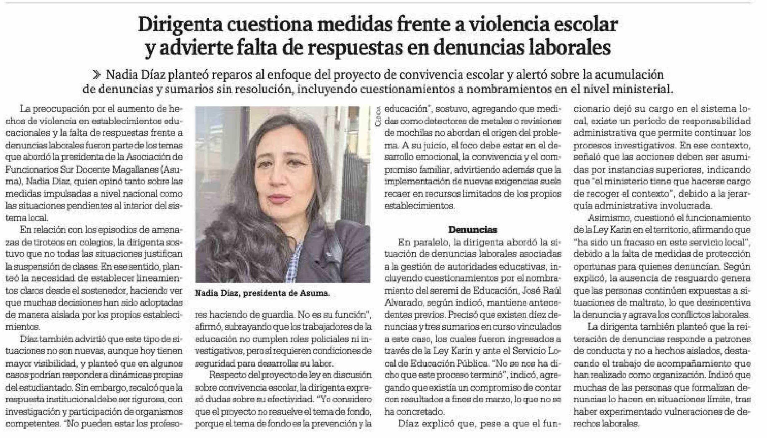 Dirigenta cuestiona medidas frente a violencia escolar y advierte falta de respuestas en denuncias laborales 21-04-2026 La Prensa Austral |