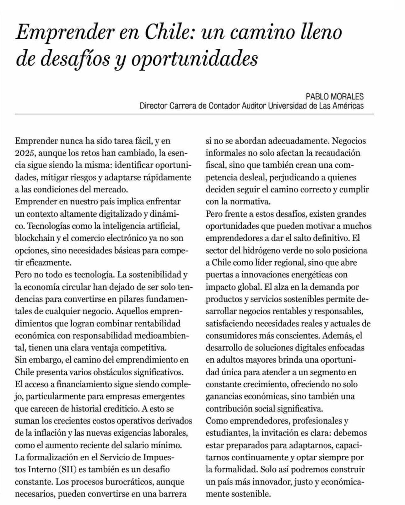 CARTAS: Emprender en Chile: un camino lleno de desafíos y oportunidades 20-05-2025 La Prensa de Curicó |