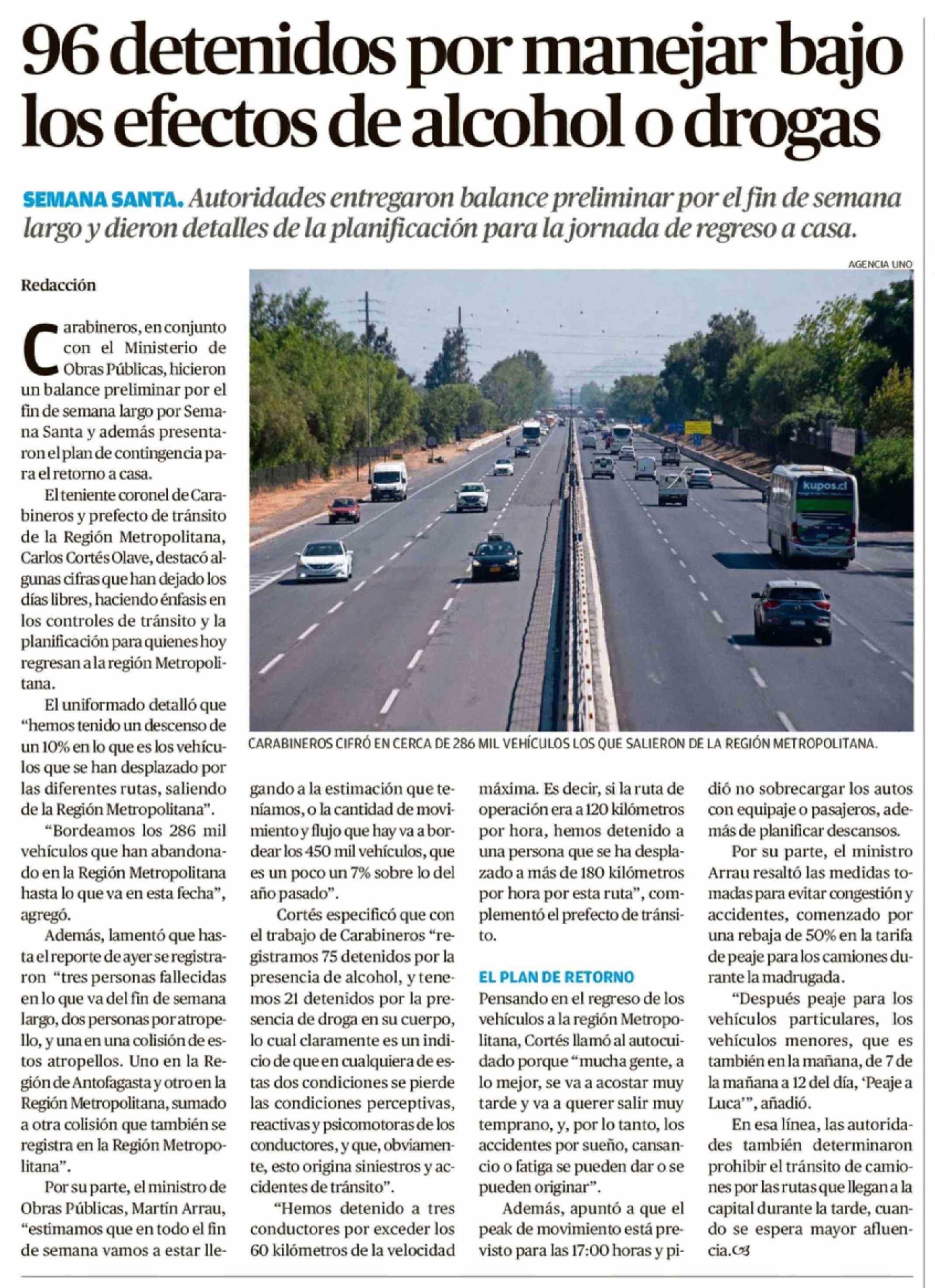 96 Detenidos por manejar bajo los efectos de alcohol o drogas 05-04-2026 Diario Austral Región de Los Ríos |