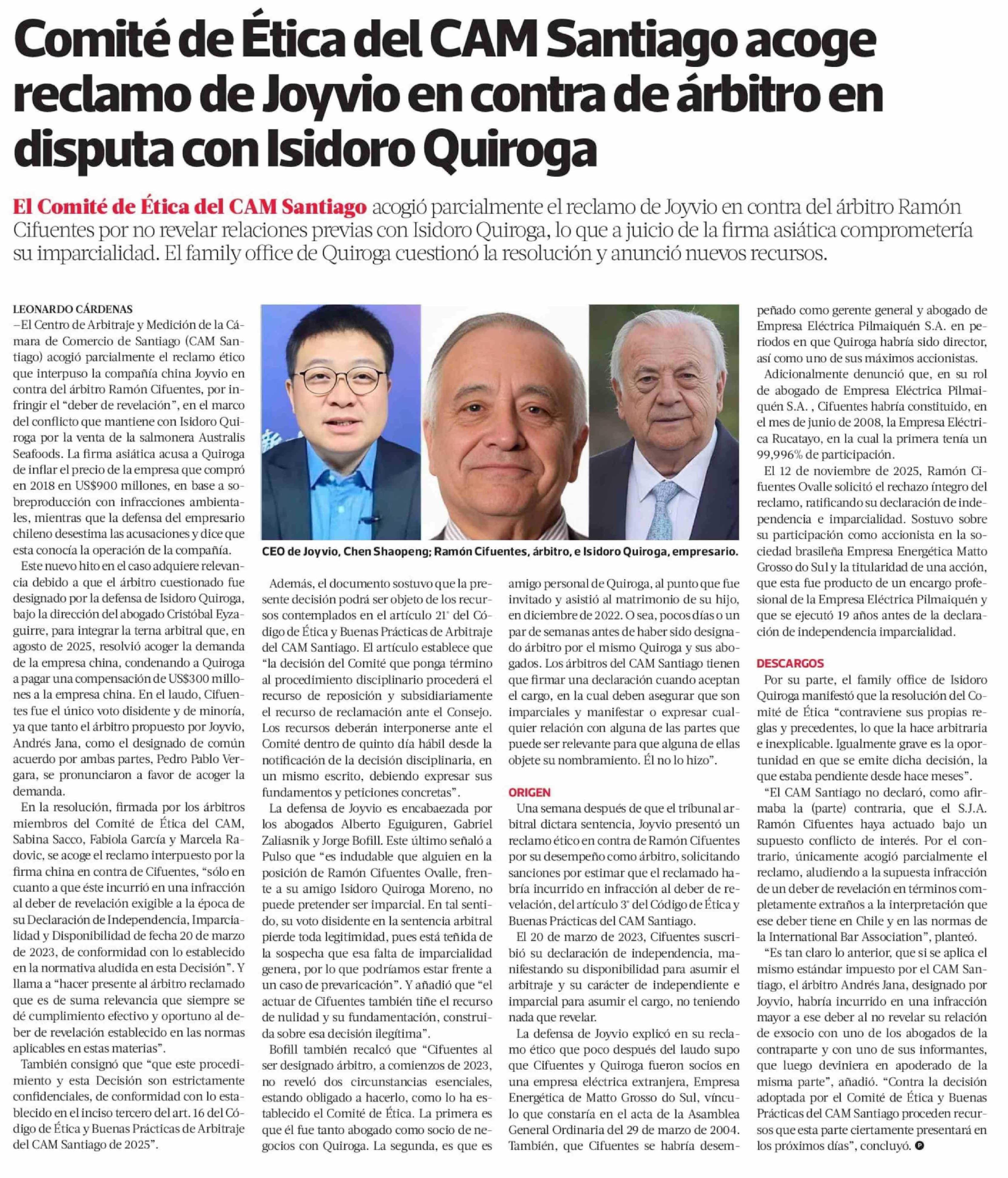 Título: Comité de Ética del CAM Santiago acoge reclamo de Joyvio en contra de árbitro en disputa con Isidoro Quiroga
