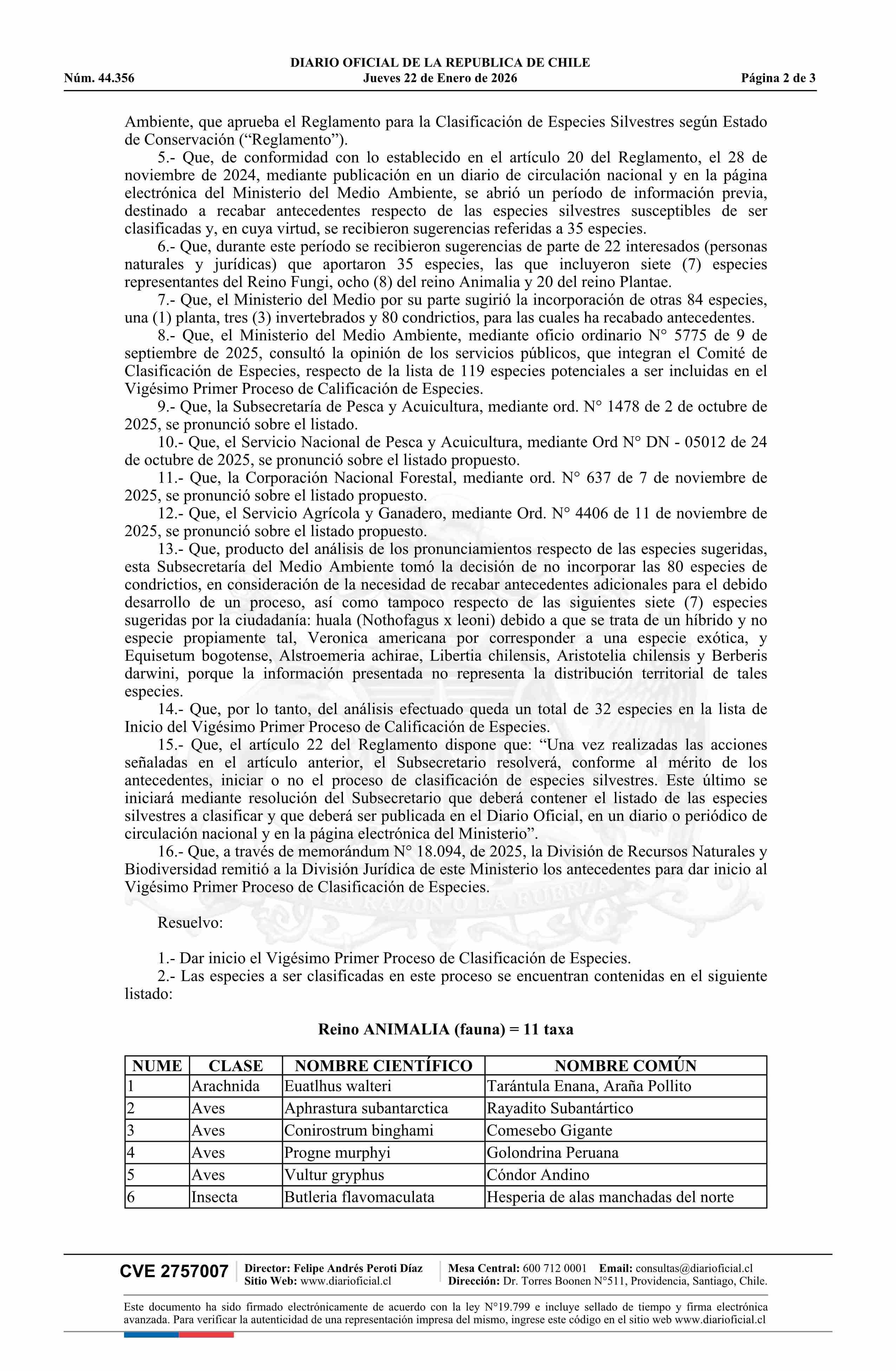 Resolución exenta número 9.517, de 2025.- Da inicio al vigésimo primer proceso de clasificación de especies e indica listado de especies a clasificar