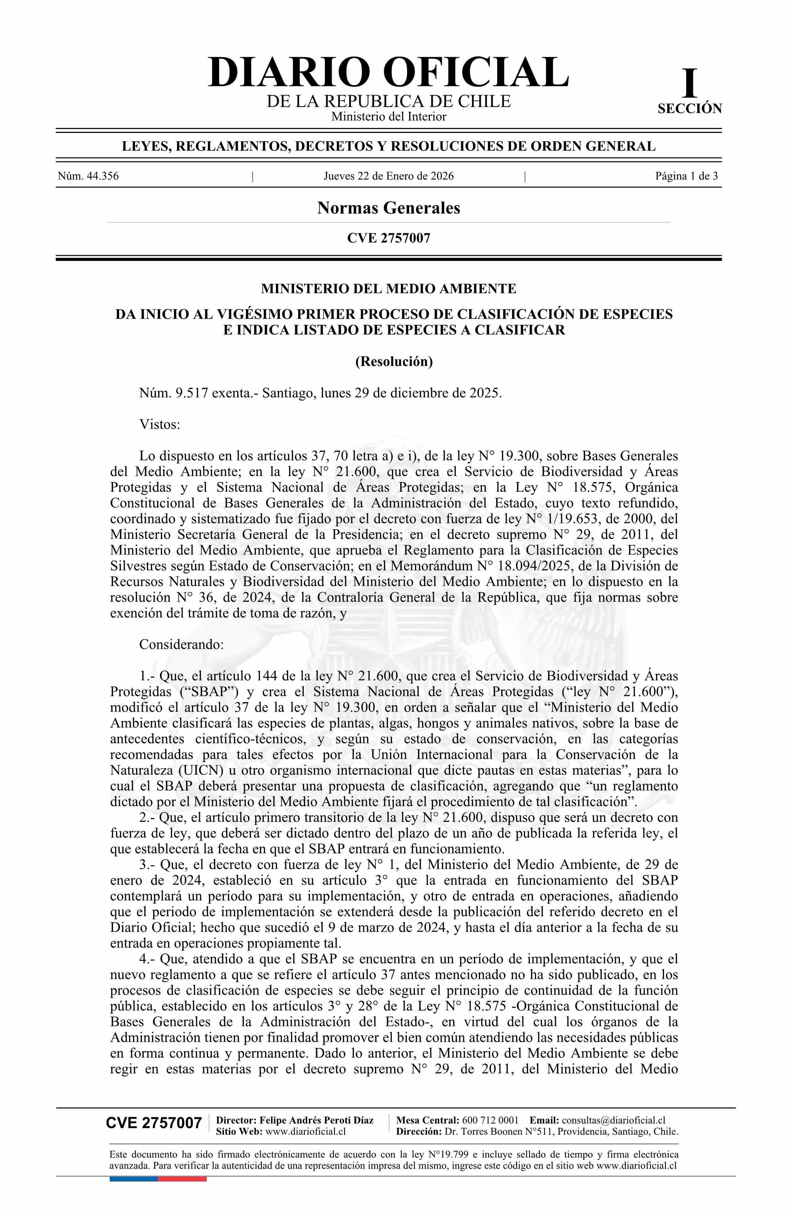 Título: Resolución exenta número 9.517, de 2025.- Da inicio al vigésimo primer proceso de clasificación de especies e indica listado de especies a clasificar