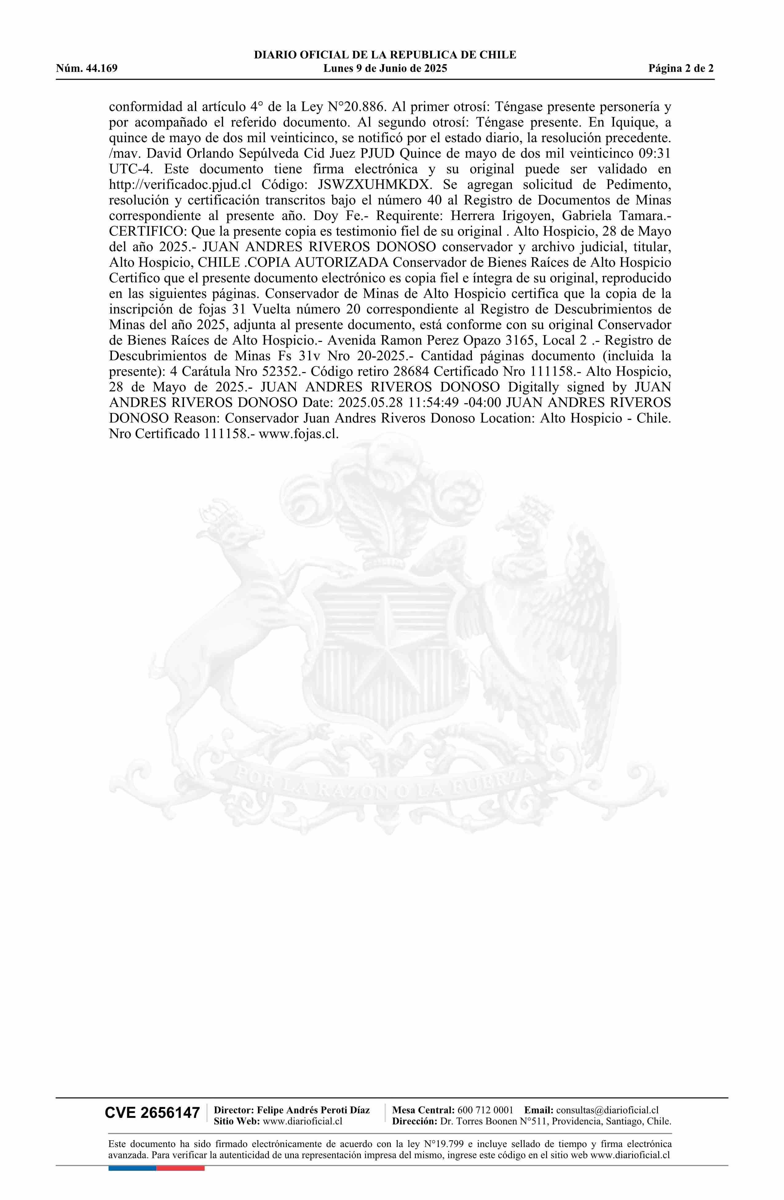 CARO 9 / Compañía Minera Cerro Colorado Limitada 09-06-2025 DIARIO OFICIAL CHILE - BOLETÍN OFICIAL DE MINERÍA |