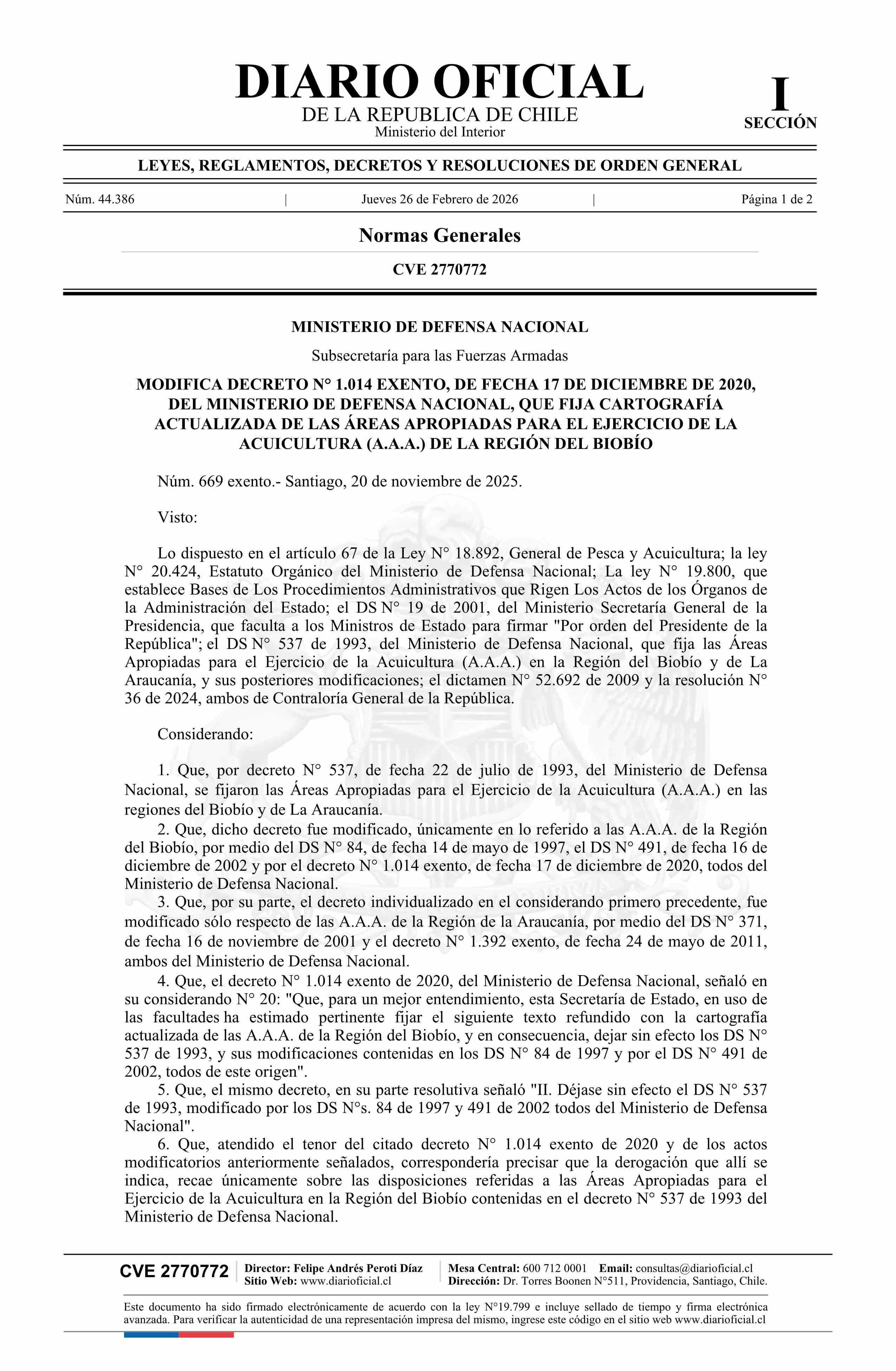 Título: Decreto exento número 669, de 2025.- Modifica decreto N° 1.014 exento, de 2020, que fija cartografía actualizada de las áreas apropiadas para el ejercicio de la acuicultura, de la Región del Biobío