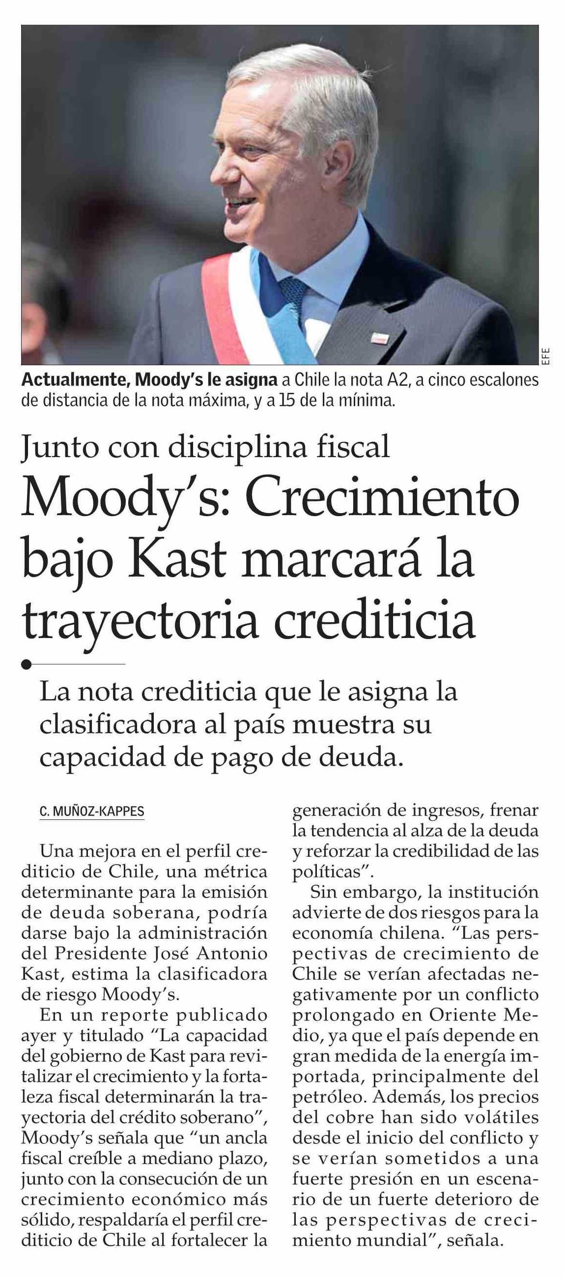 Moody’s: Crecimiento bajo Kast marcará la trayectoria crediticia 12-03-2026 El Mercurio |