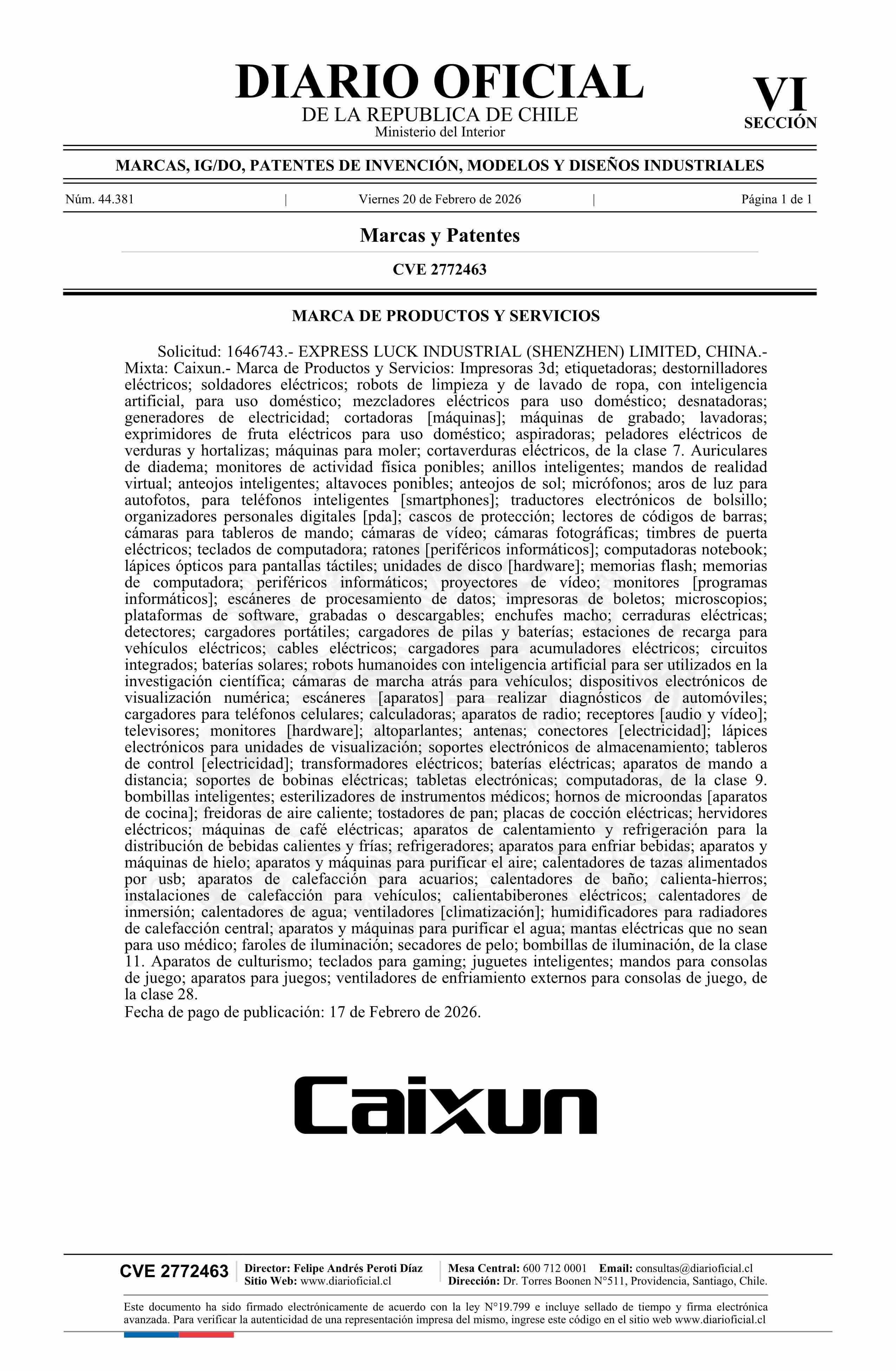 Solicitud número 1646743.- Caixun 20-02-2026 Diario Oficial Edición Electrónica |