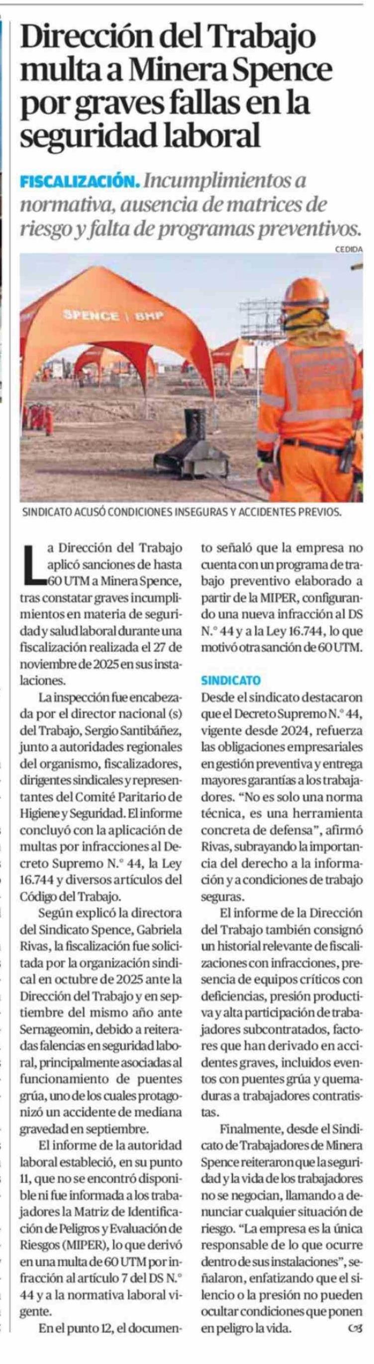Dirección del Trabajo multa a Minera Spence por graves fallas en la seguridad laboral 18-02-2026 El Mercurio de Calama |