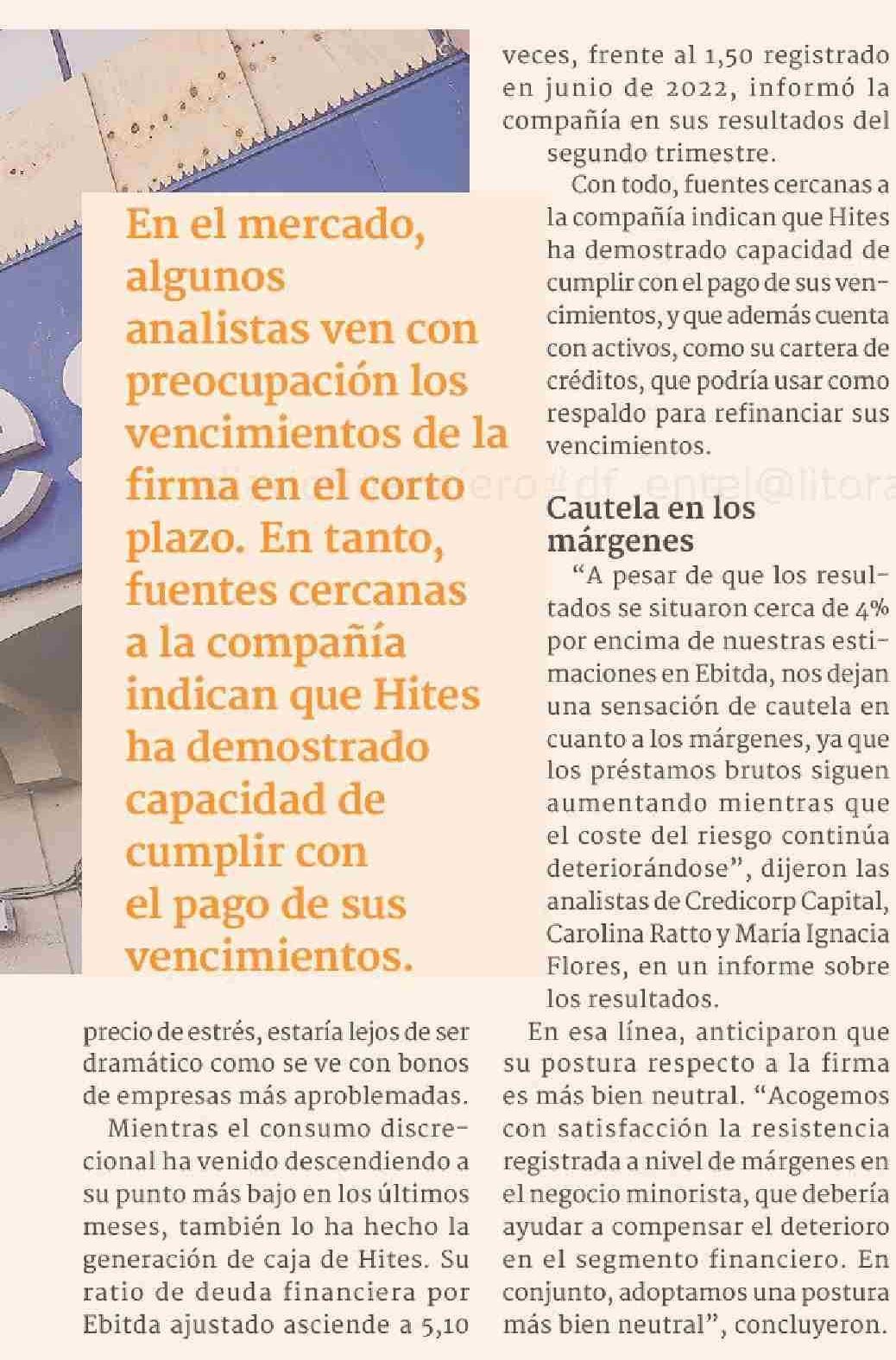 Bono de Hites cae con fuerza en mercado secundario y pone de relieve los desafíos financieros de la firma 13-09-2023 Diario Financiero |