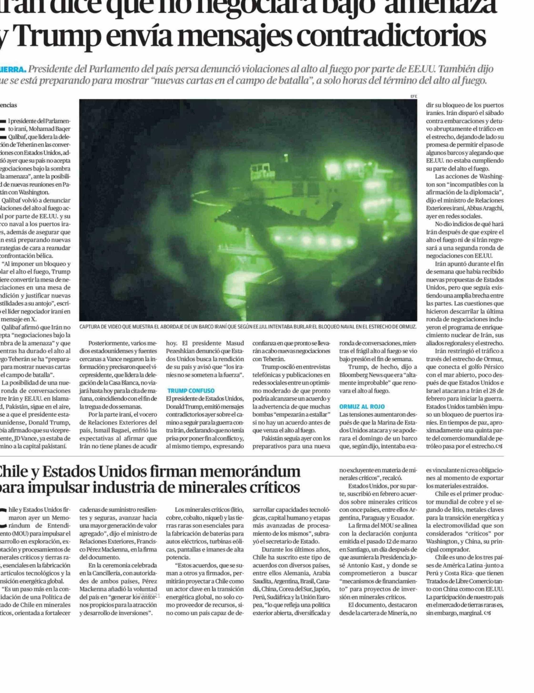 Irán dice que no negociará bajo 'amenaza' y Trump envía mensajes contradictorios 21-04-2026 El Mercurio de Antofagasta |