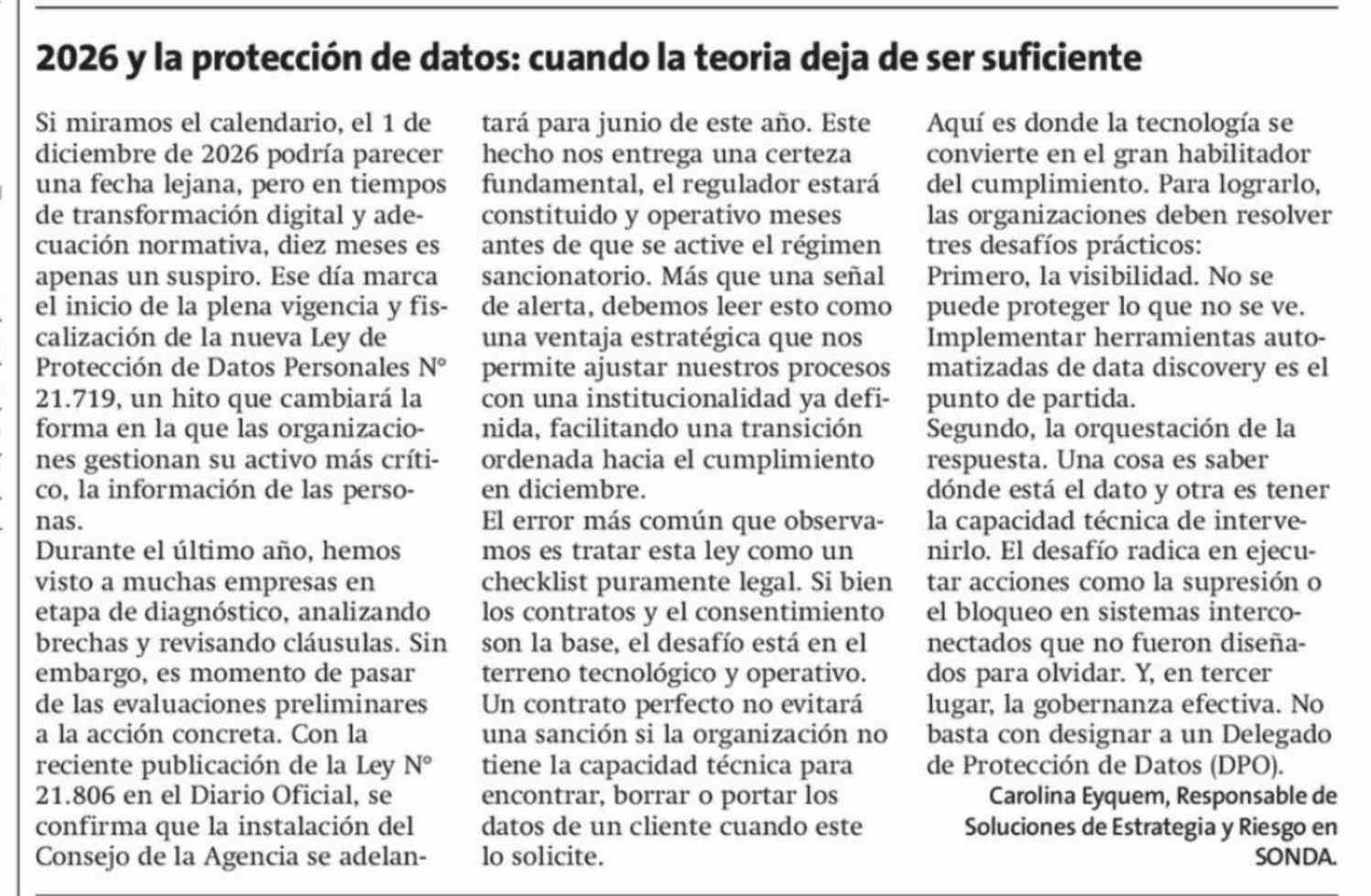 Columnas de Opinión: 2026 Y la protección de datos: cuando la teoria deja de ser suficiente 20-02-2026 La Estrella de Quillota |