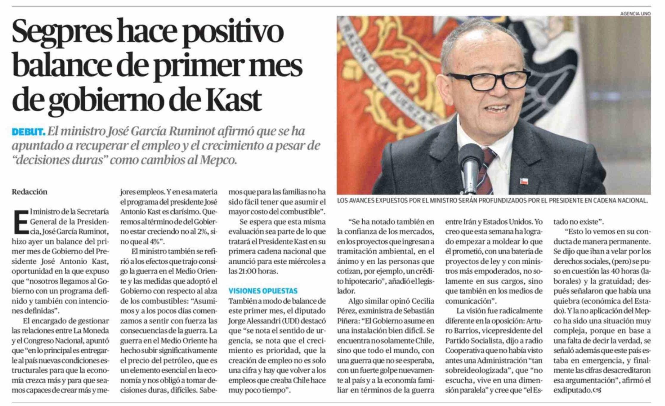Segpres hace positivo balance de primer mes de gobierno de Kast 12-04-2026 El Mercurio de Antofagasta |
