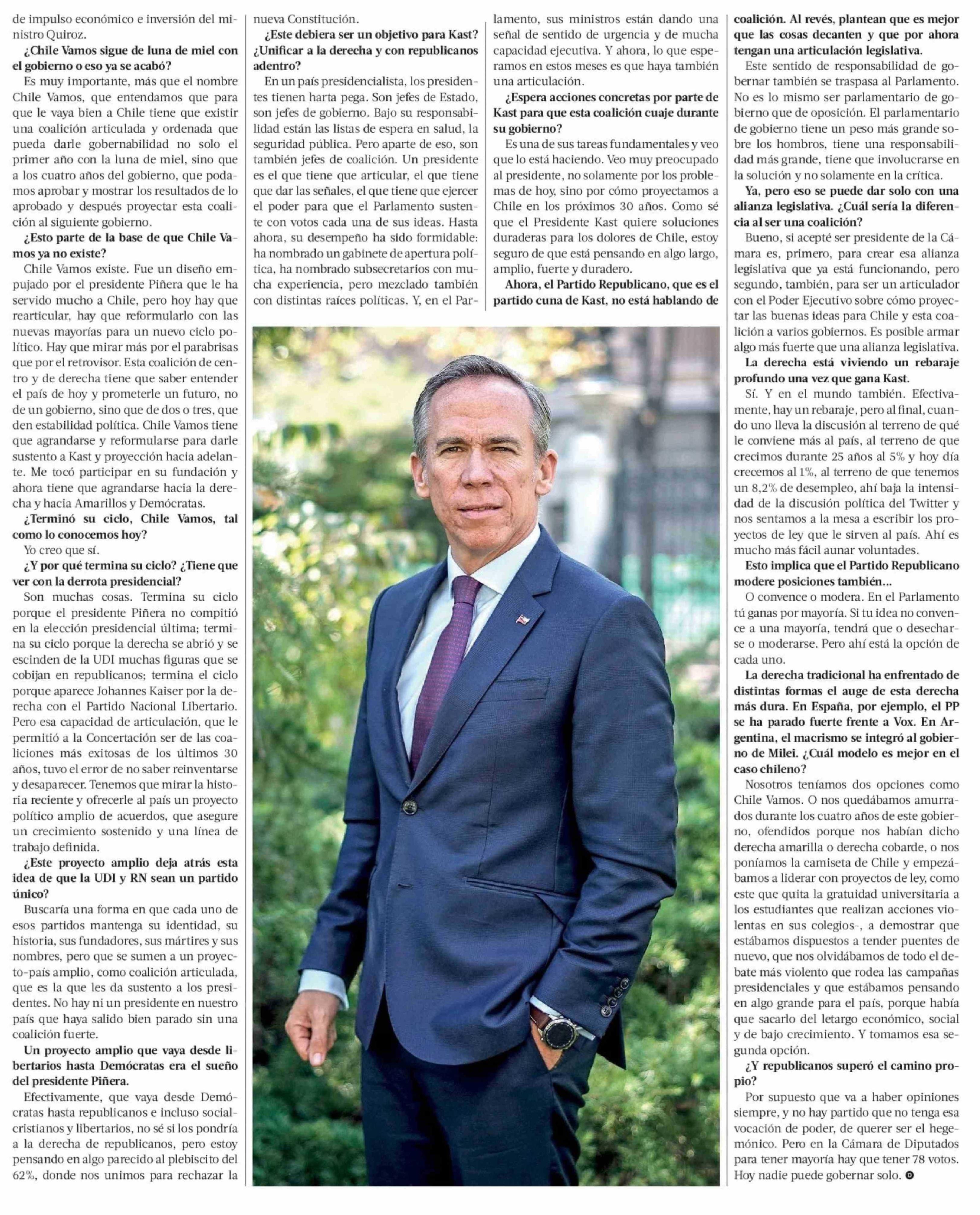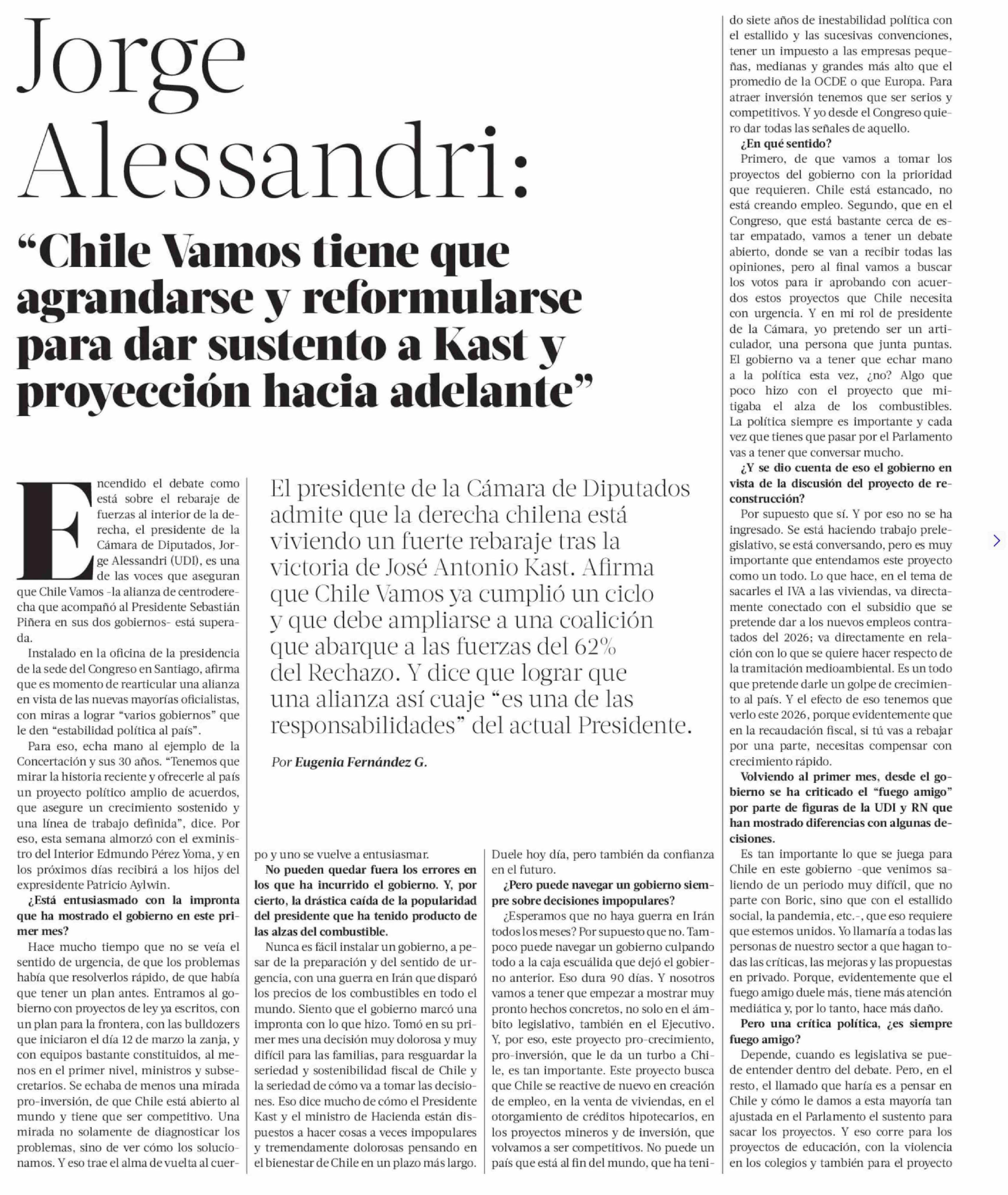 Jorge Alessandri: "Chile Vamos tiene que agrandarse y reformularse para dar sustento a Kast y proyección hacia adelante" 12-04-2026 La Tercera |