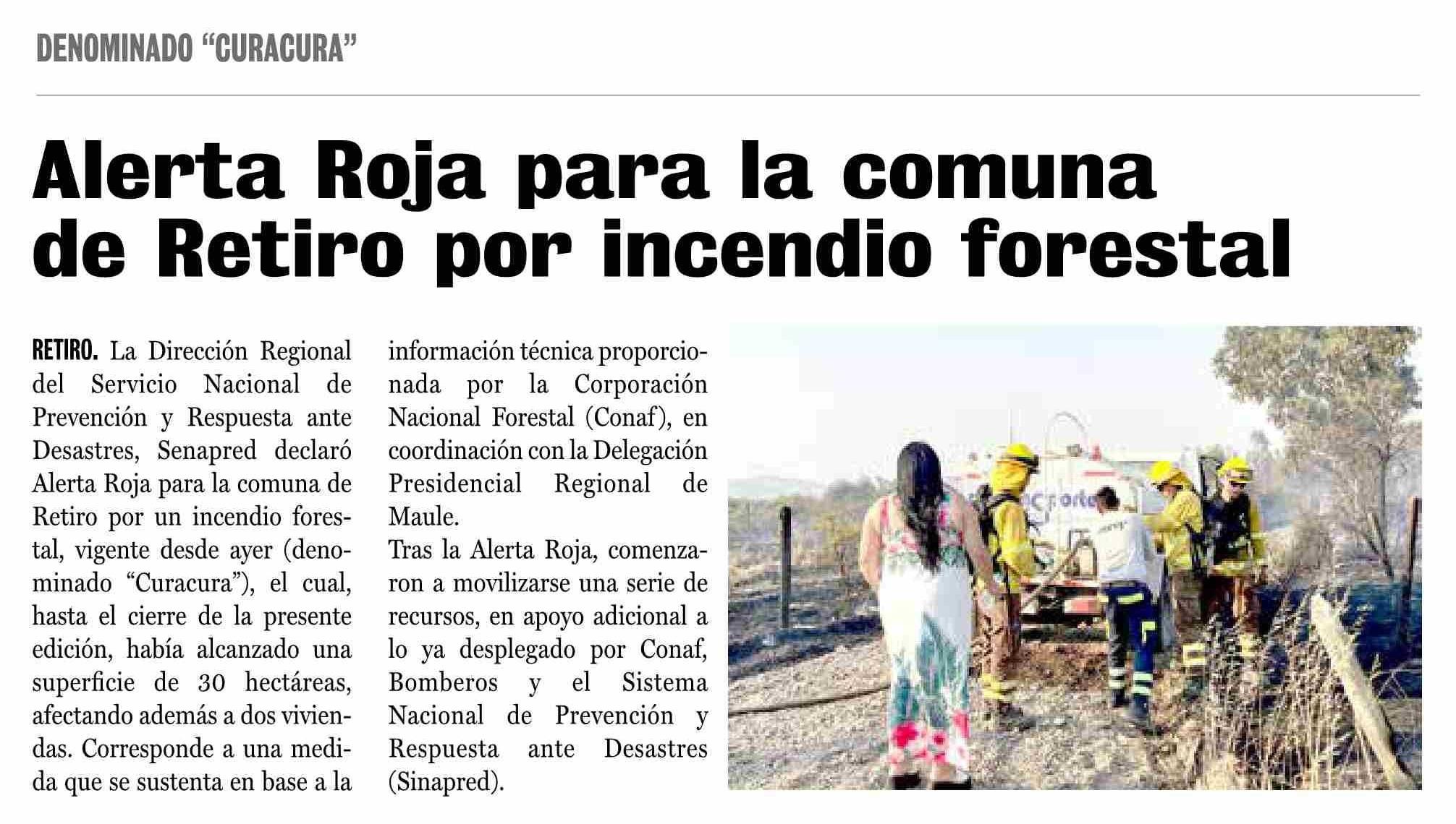 Título: Alerta Roja para la comuna de Retiro por incendio forestal