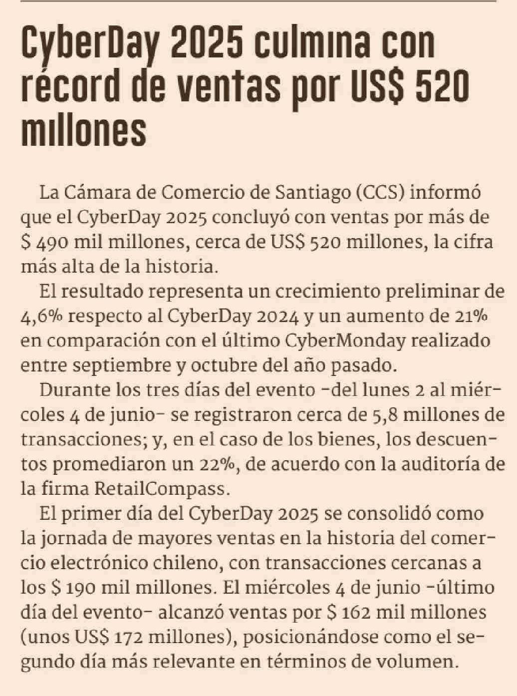 CyberDay 2025 culmina con record de ventas por US$ 520 millones 06-06-2025 Diario Financiero |