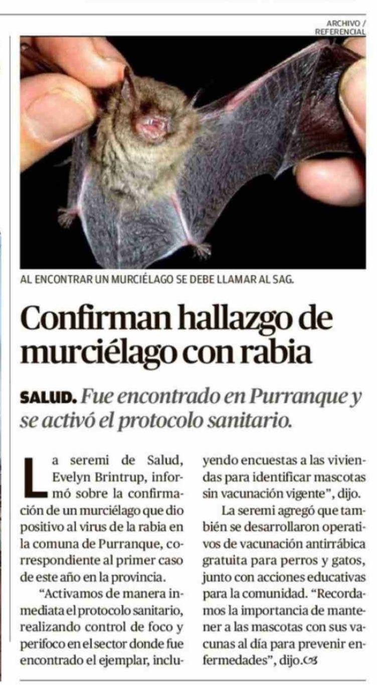 Confirman hallazgo de murciélago con rabia 13-04-2026 El Austral de Osorno |