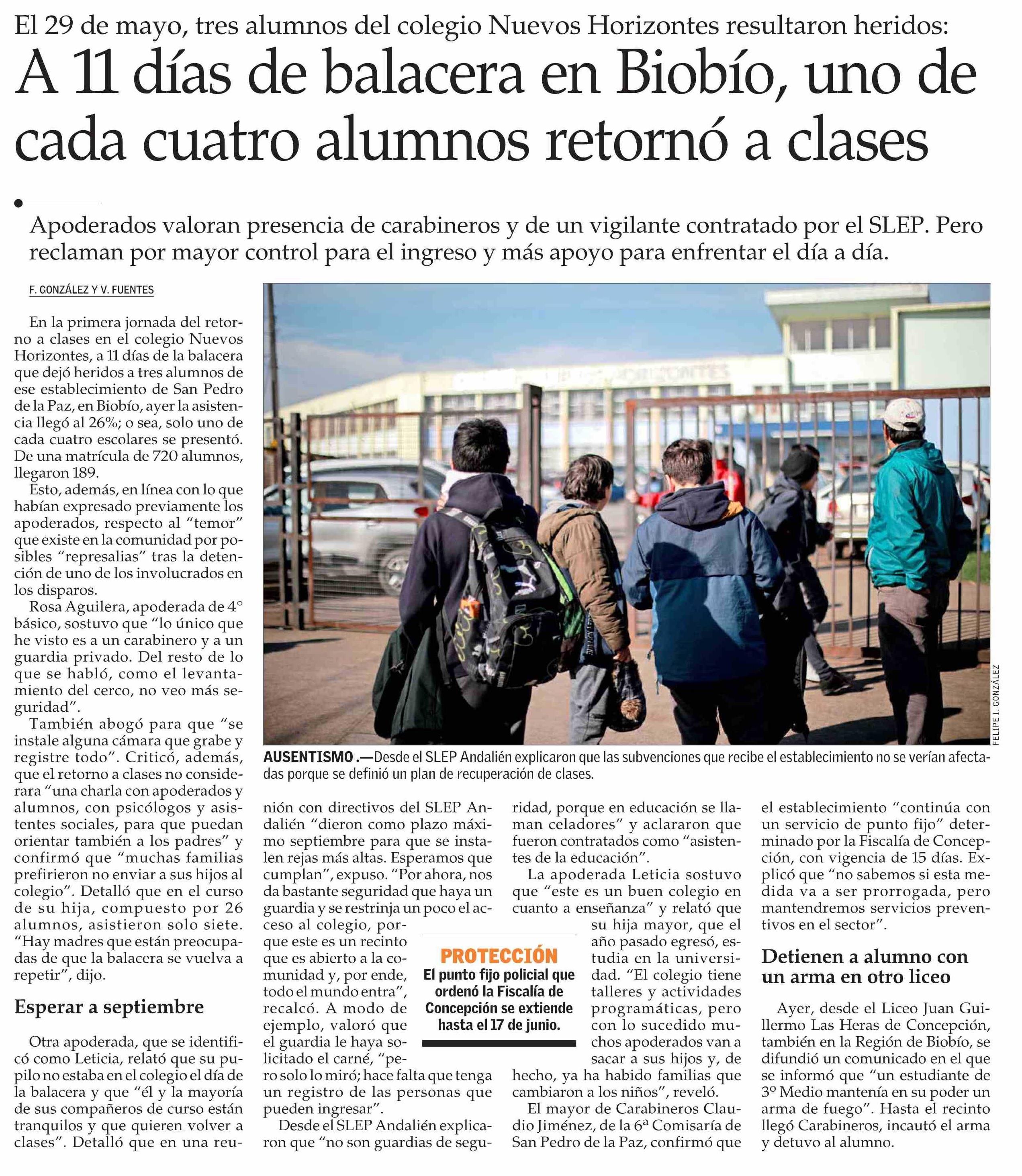 A 11 días de balacera en Biobío, uno de cada cuatro alumnos retornó a clases 10-06-2025 El Mercurio |