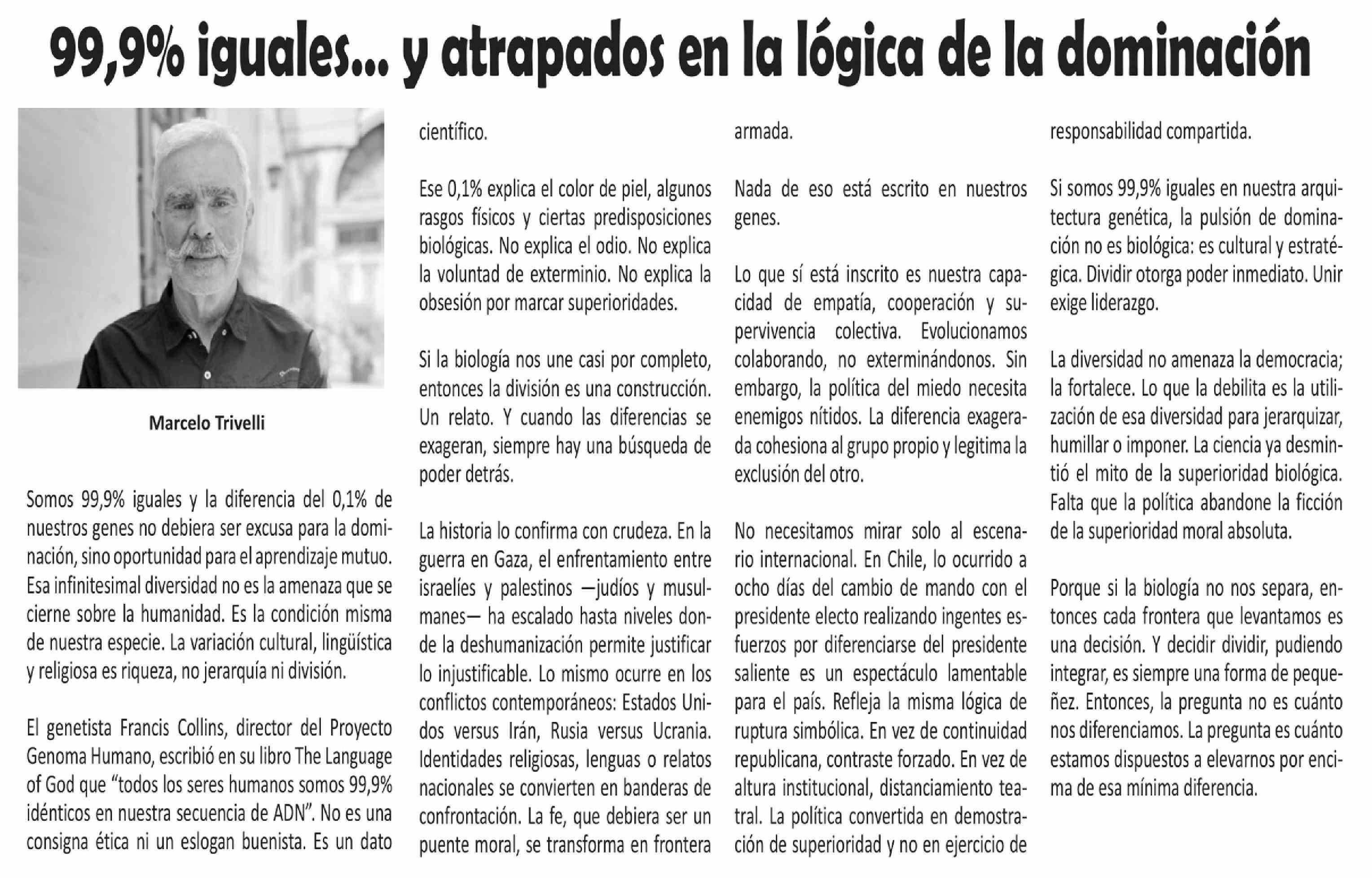 Título: Columnas de Opinión: 99,9% Iguales ... y atrapados en la lógica de la dominación