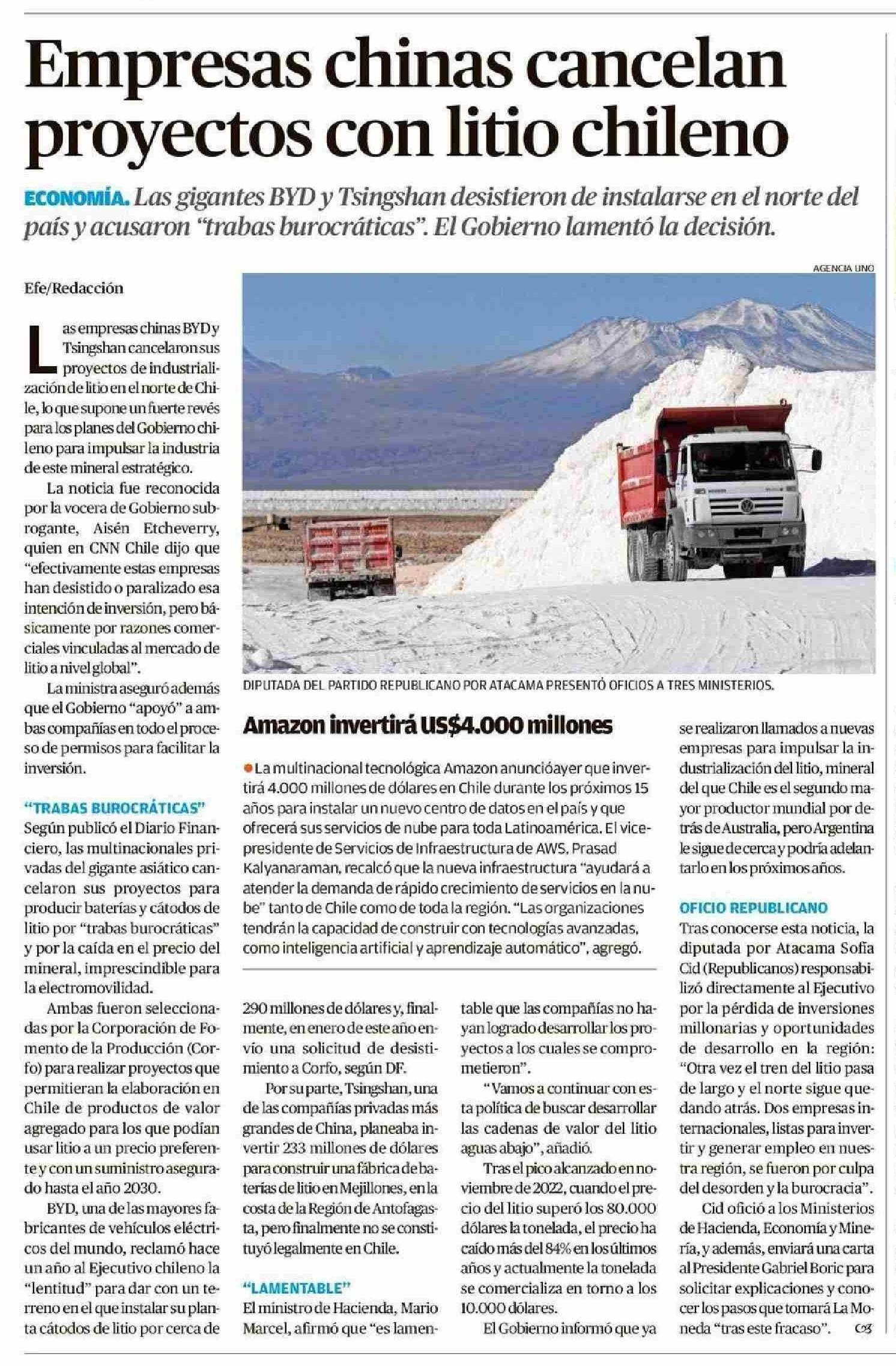 Empresas chinas cancelan proyectos con litio chileno 08-05-2025 El Austral de Osorno |