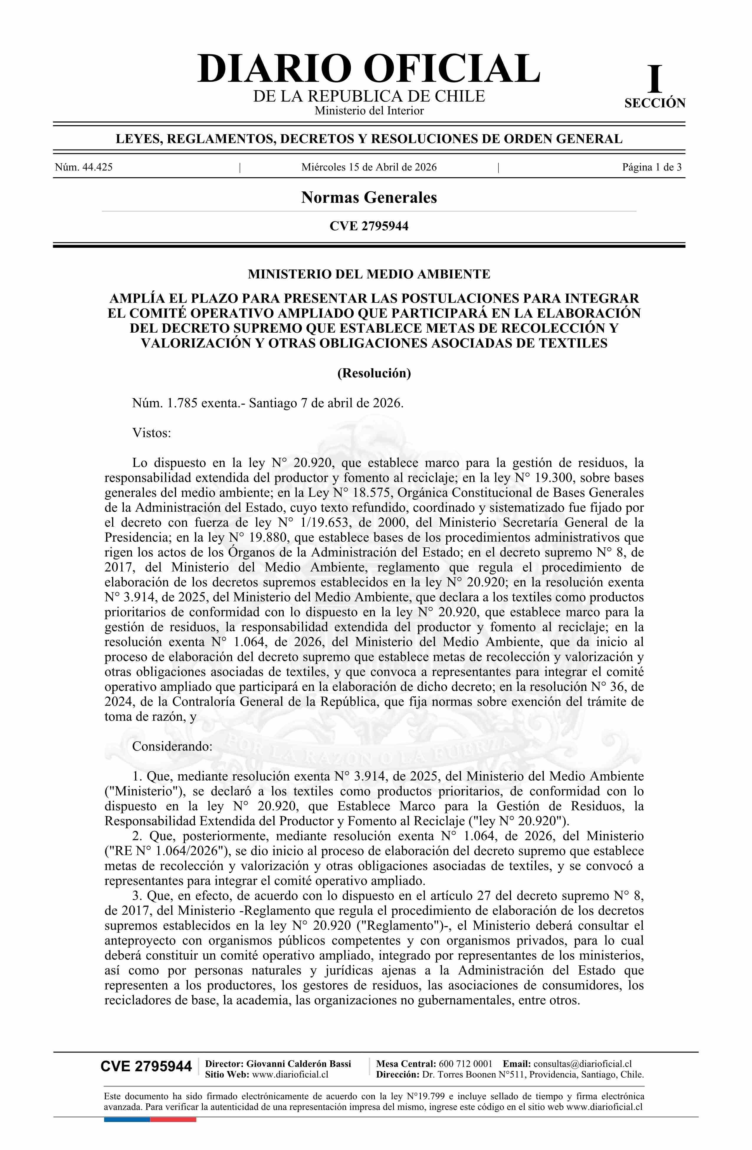 | Título: | Resolución exenta número 1.785, de 2026.- Amplía el plazo para presentar las postulaciones para integrar el comité operativo ampliado que participará en la elaboración del decreto supremo que establece metas de recolección y valorización y otras obligaciones asociadas de textiles |