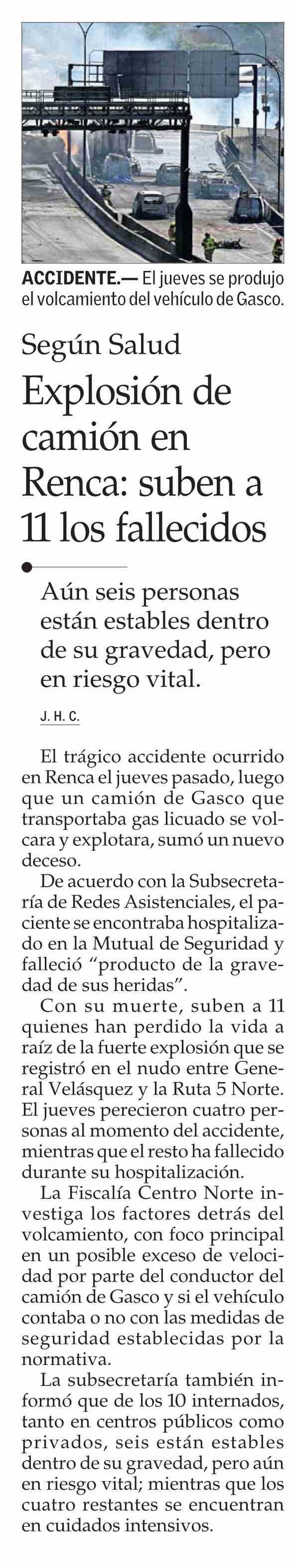 Título: Explosión de camión en Renca: suben a 11 los fallecidos