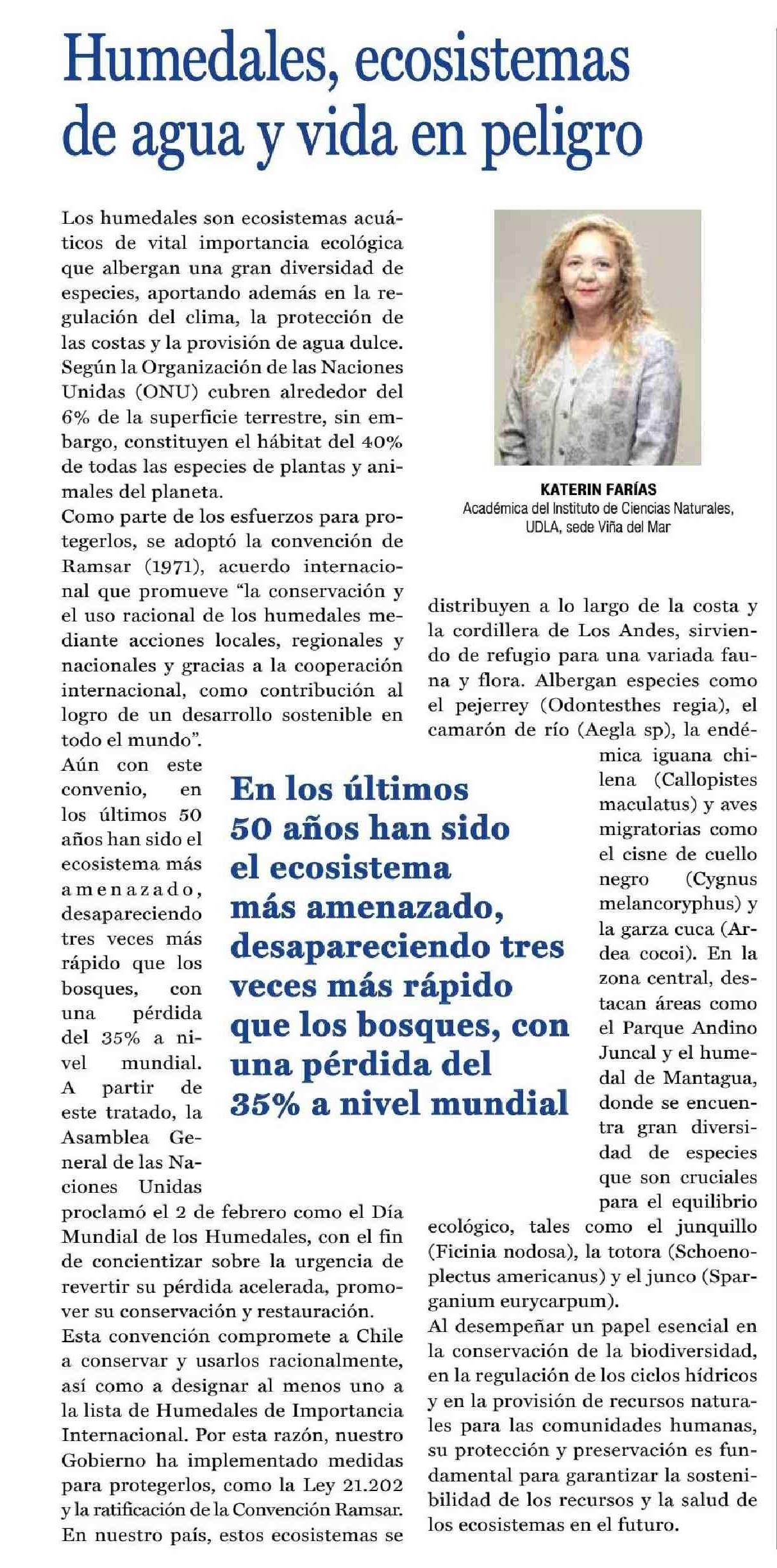 COLUMNAS DE OPINIÓN: Humedales, ecosistemas de agua y vida en peligro 04-02-2025 La Prensa de Curicó |