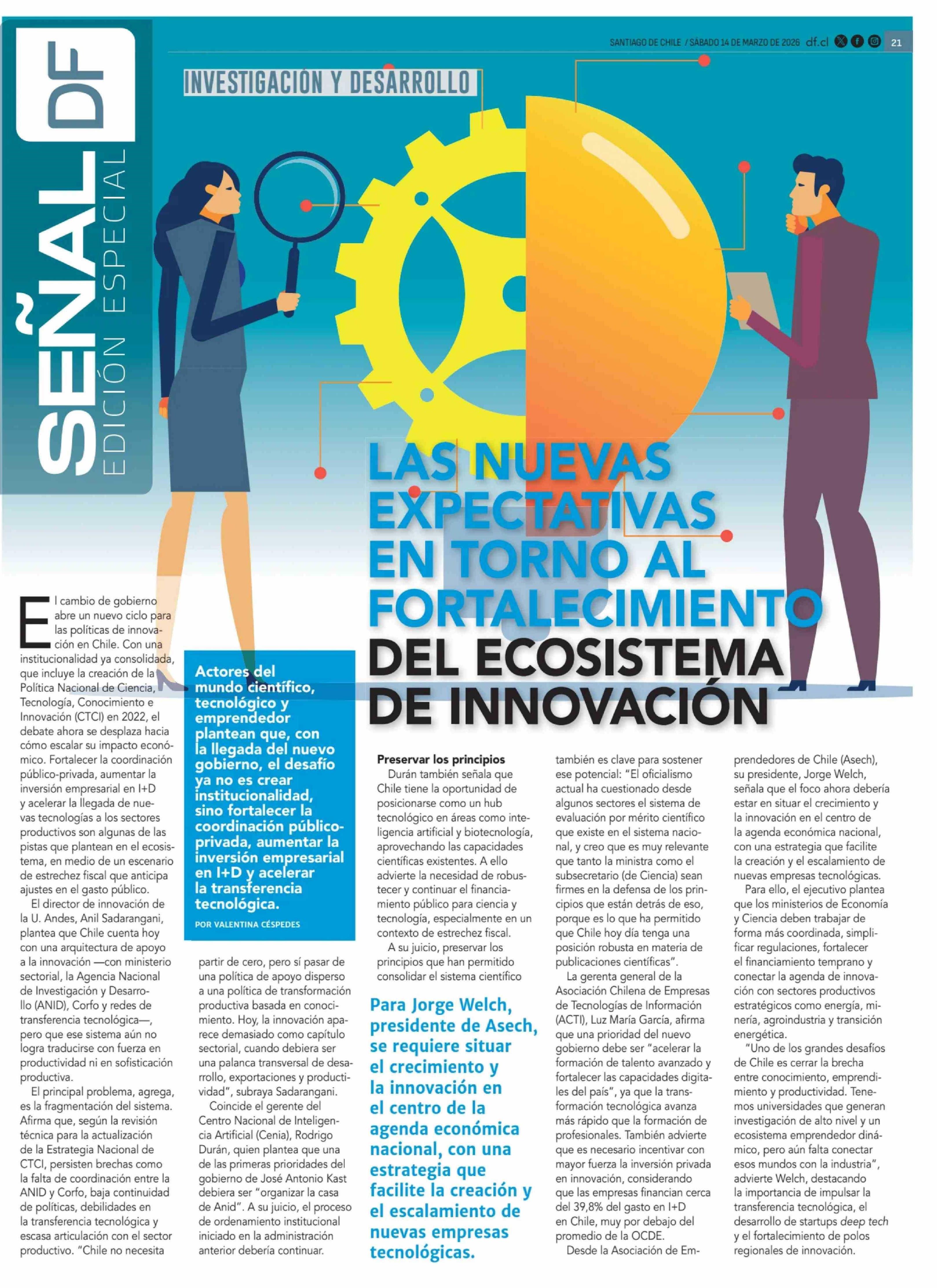 LAS NUEVAS EXPECTATIVAS EN TORNO AL FORTALECIMIENTO DEL ECOSISTEMA DE INNOVACIÓN 14-03-2026 Diario Financiero |