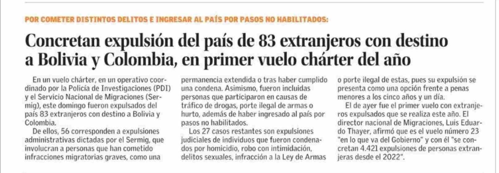 Título: Concretan expulsión del país de 83 extranjeros con destino a Boliiia y Colombia, en primer cliárter del año