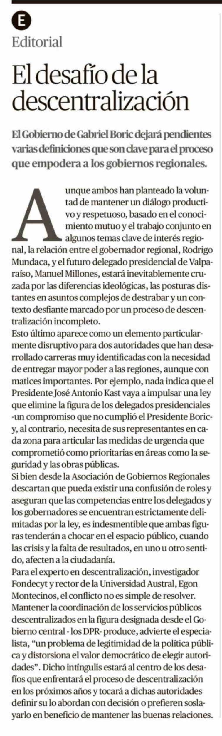 Editorial: El desafío de la descentralización 18-02-2026 El Mercurio de Valparaíso |
