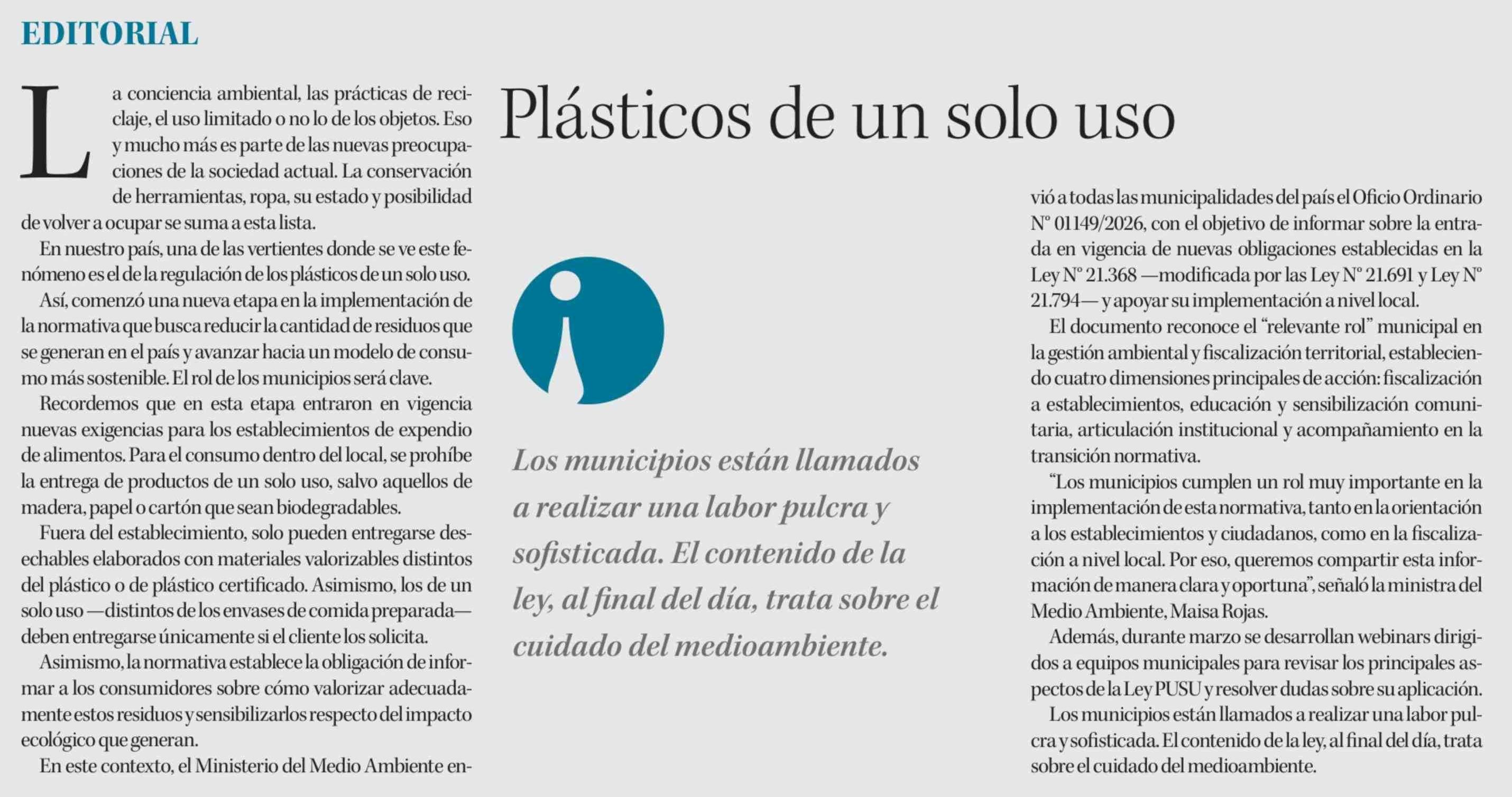 Editorial: Plásticos de un solo uso 03-03-2026 Diario Concepción |