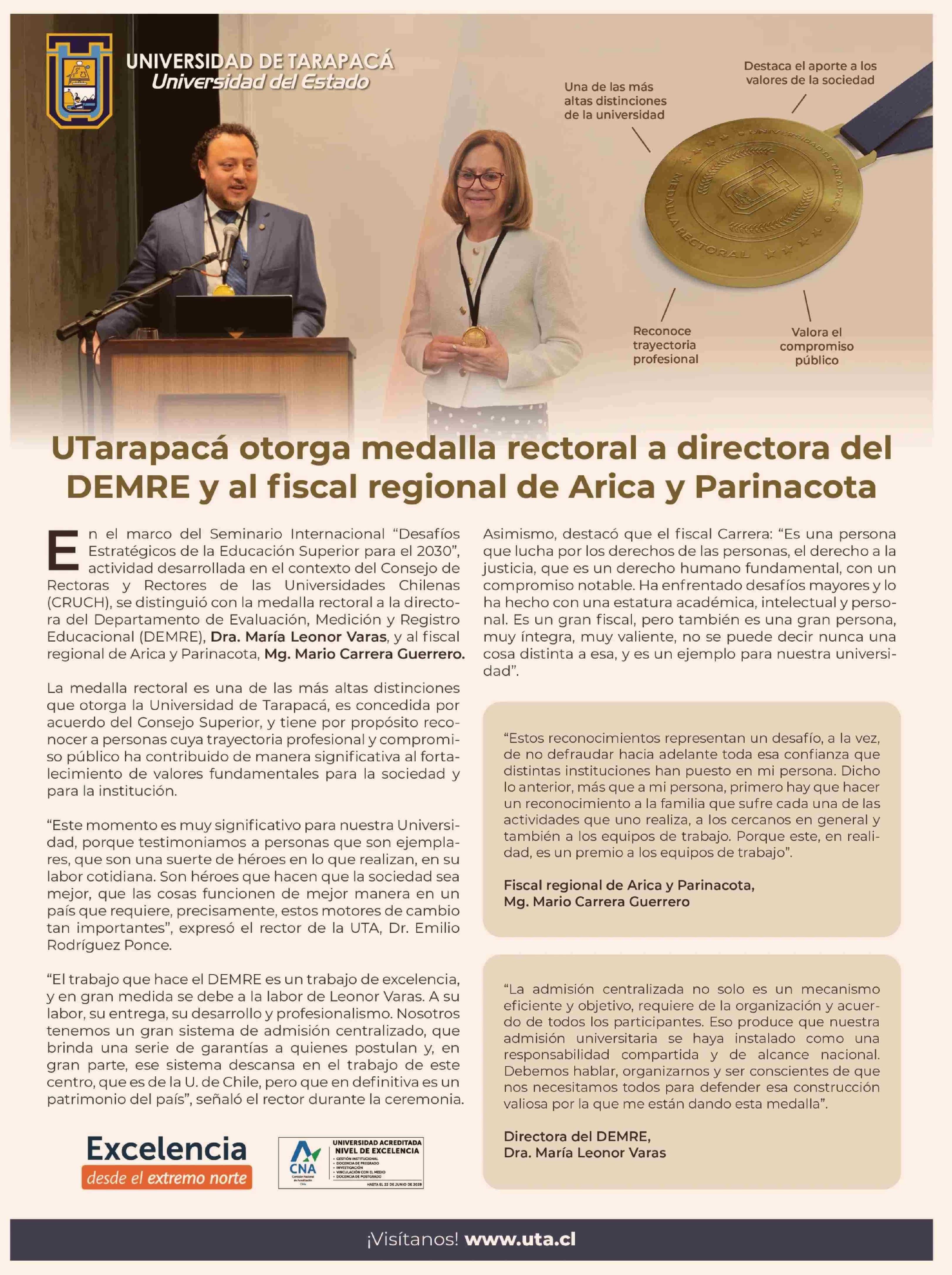 Título: UTarapacá otorga medalla rectoral a directora del DEMRE y al fiscal regional de Arica y Parinacota