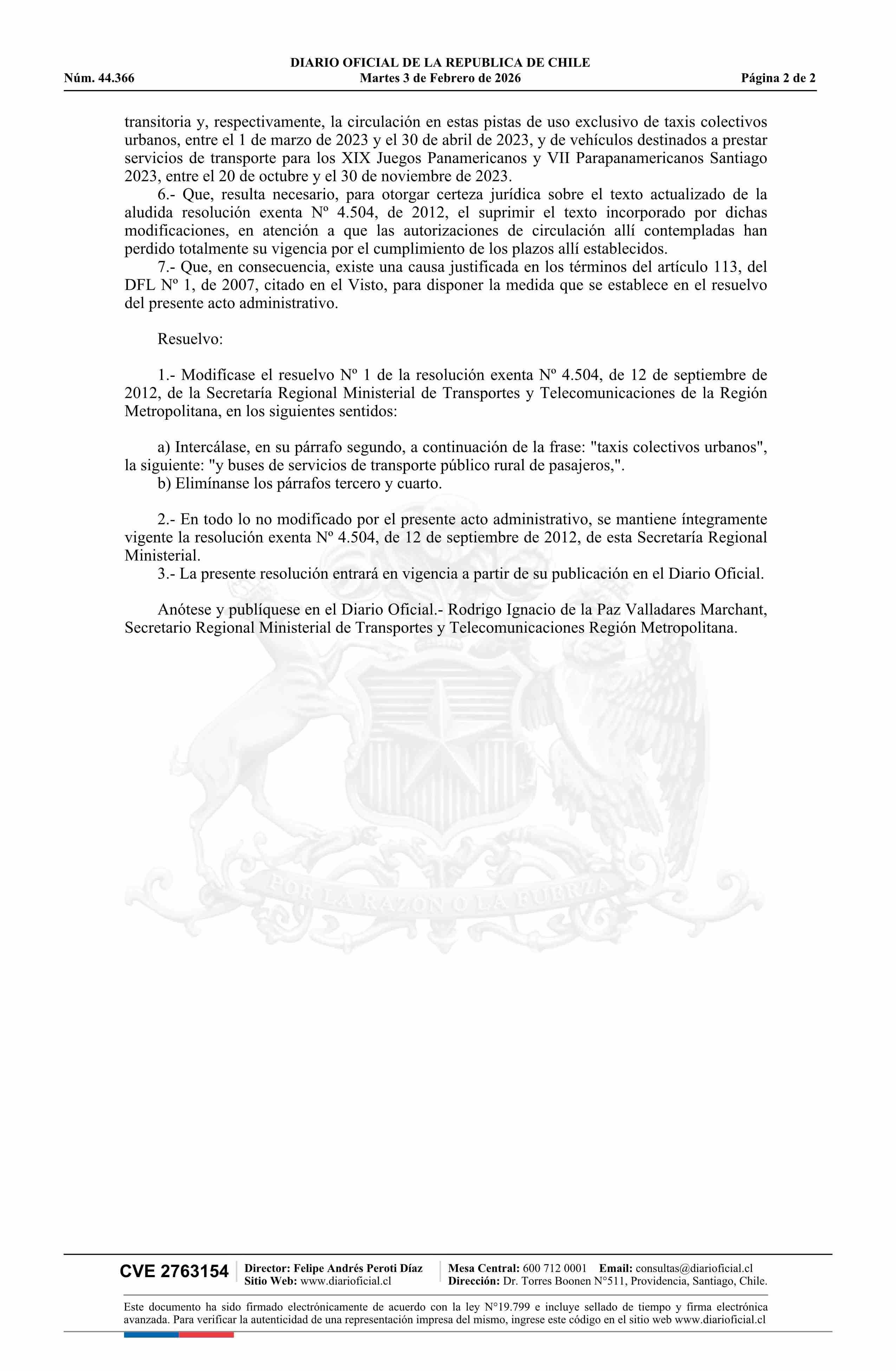 Resolución exenta número 186, de 2026.- Modifica resolución Nº 4.504 exenta, de 2012 03-02-2026 Diario Oficial Edición Electrónica |