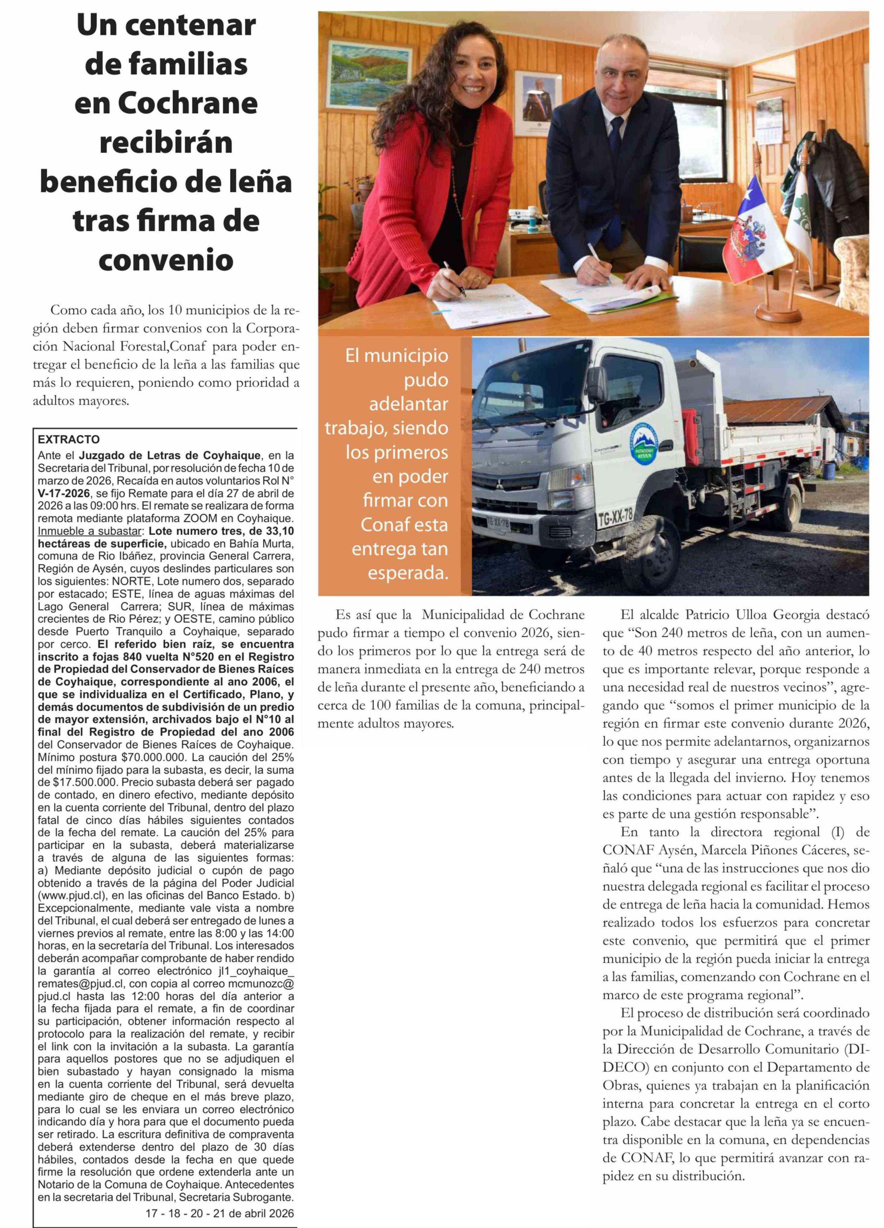 Título: Un centenar de familias en Cochrane recibirán beneficio de leña tras firma de convenio