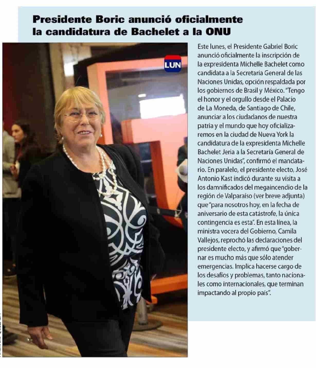Título: Presidente Boric anunció oficialmente la candidatura de Bachelet a la ONU