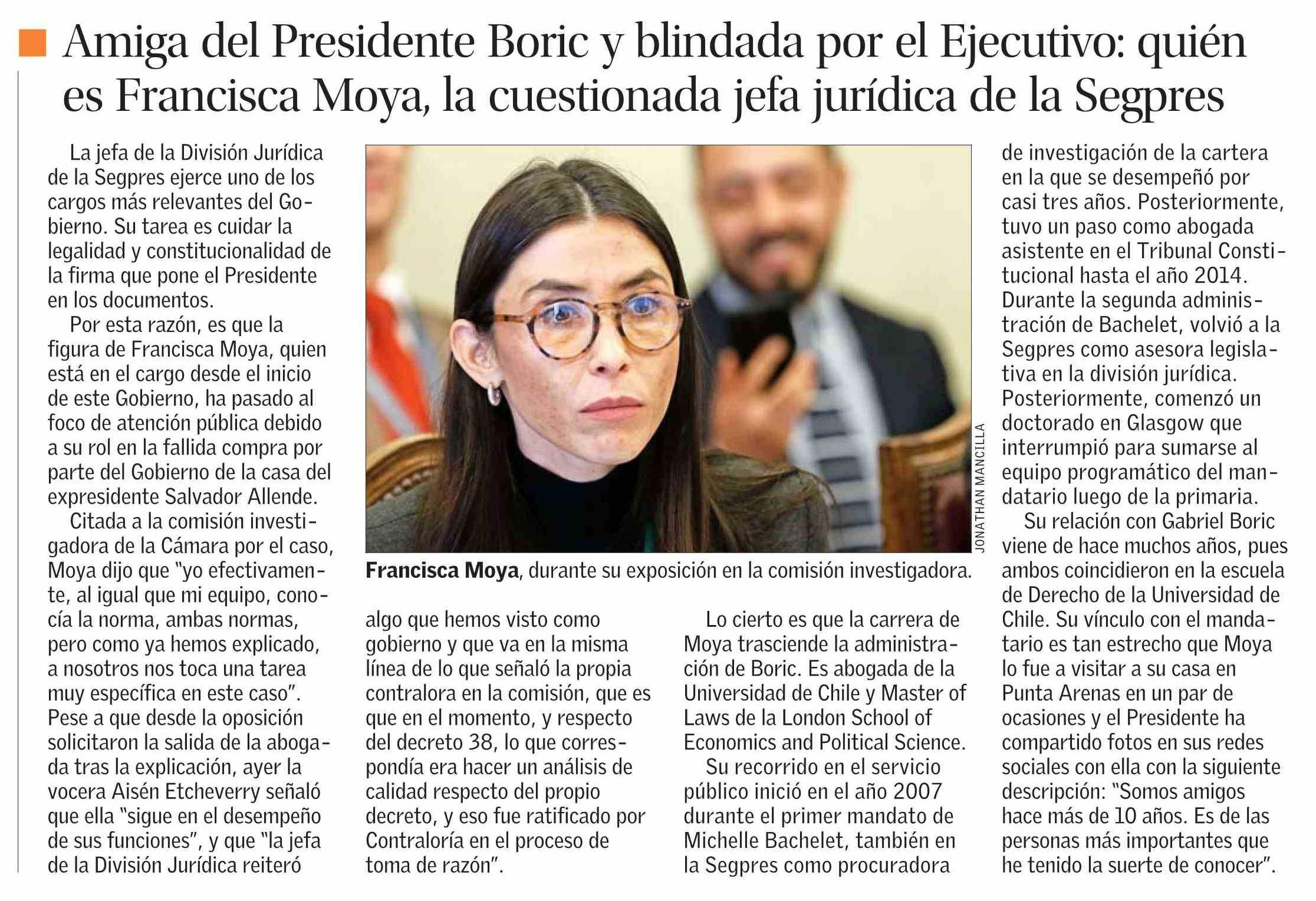 N Amiga del Presidente Boric y blindada por el Ejecutivo: quién es Francisca Moya, la cuestionada jefa jurídica de la Segpres 09-04-2025 El Mercurio |