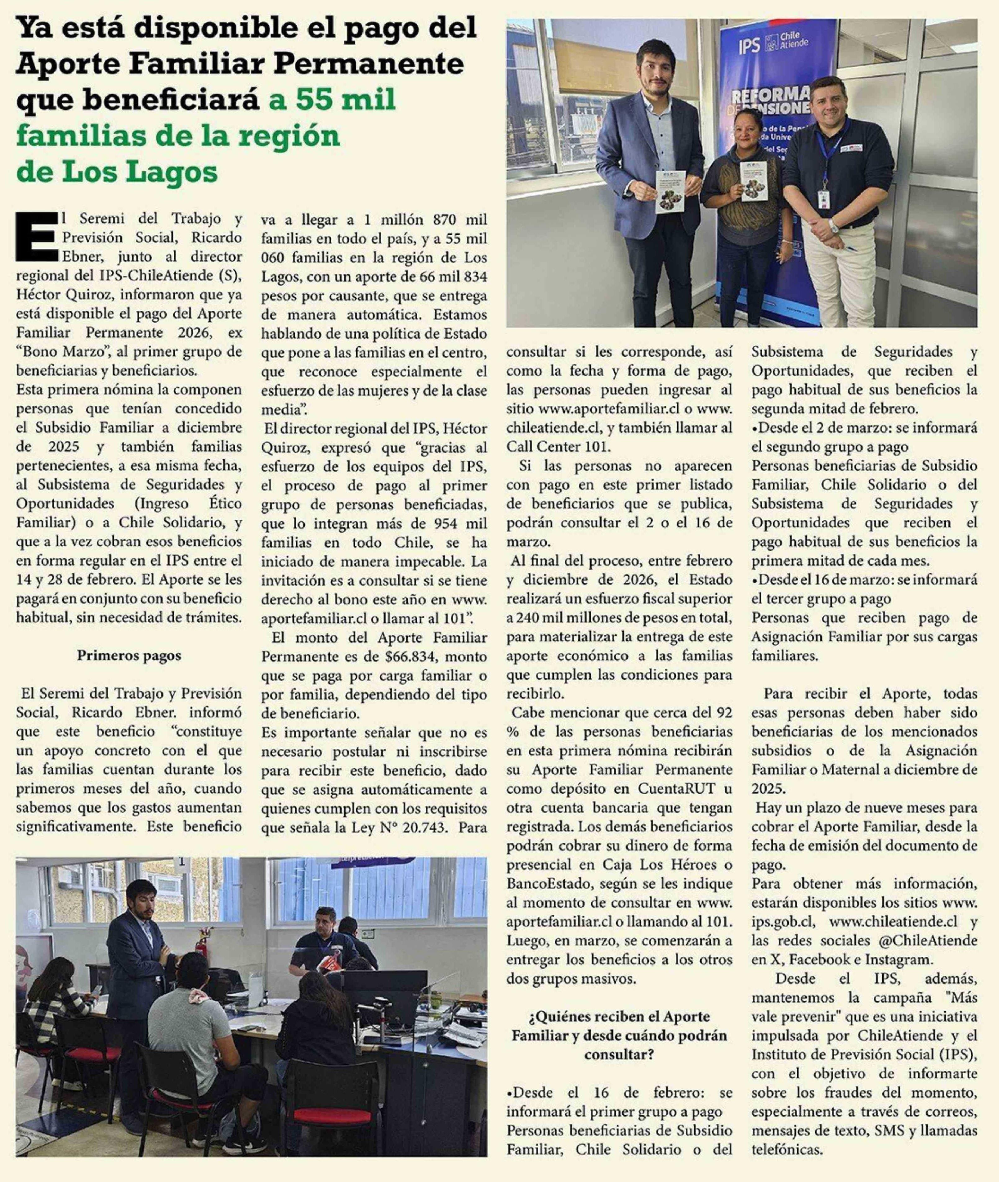 Ya está disponible el pago del Aporte Familiar Permanente que beneficiará a 55 mil familias de la región de Los Lagos 21-02-2026 El Heraldo Austral |