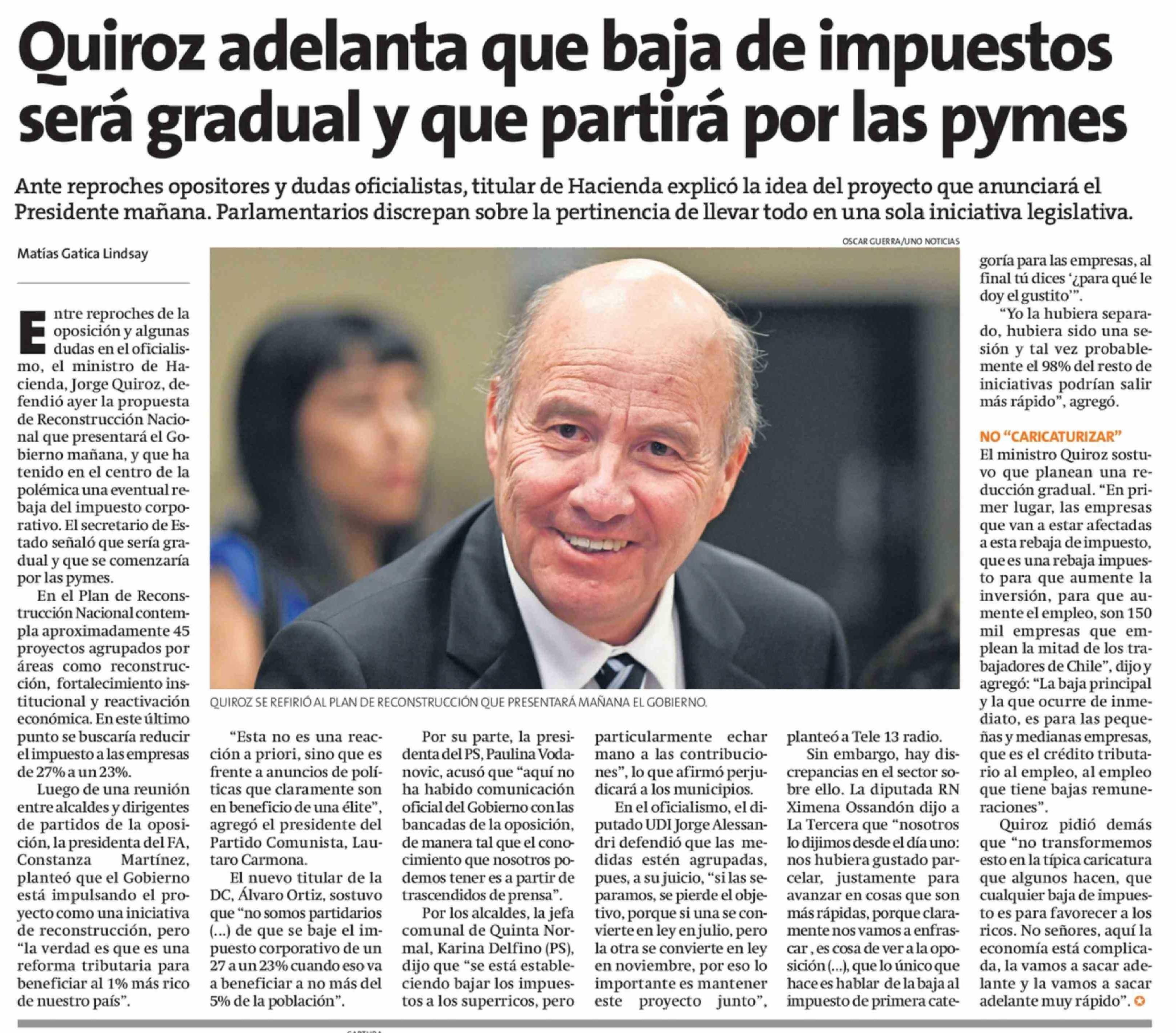 Título: Quiroz adelanta que baja de impuestos será gradual y que partirá por las pymes