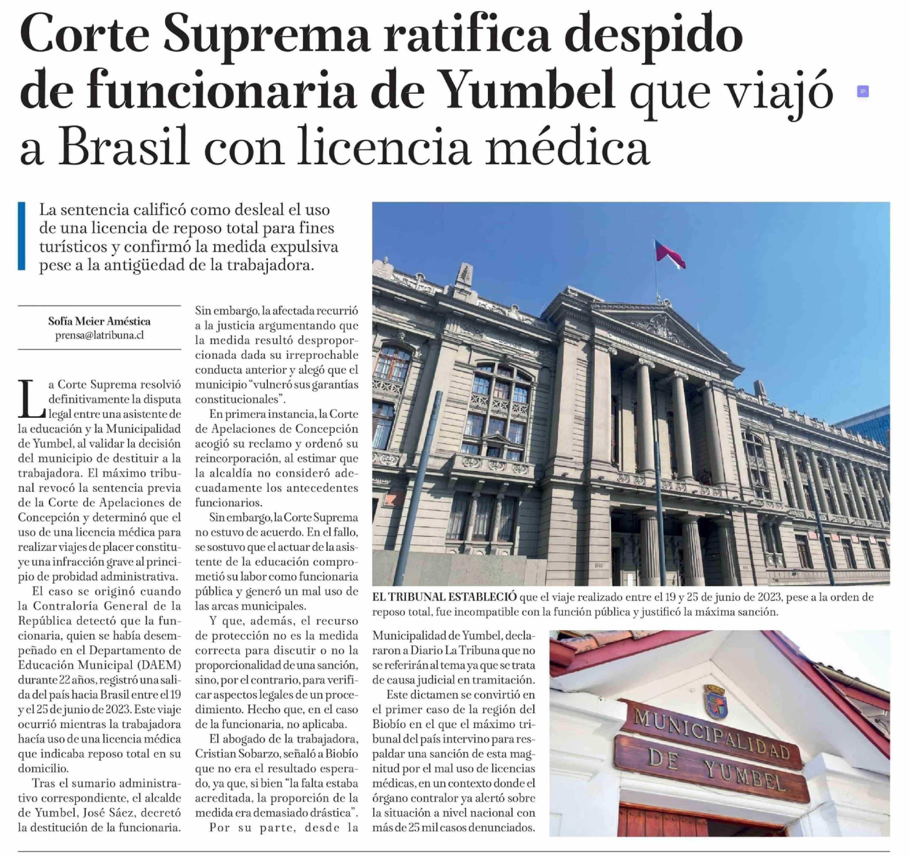 Corte Suprema ratifica despido de funcionaria de Yumbel que viajó a Brasil con licencia médica 17-02-2026 La Tribuna |