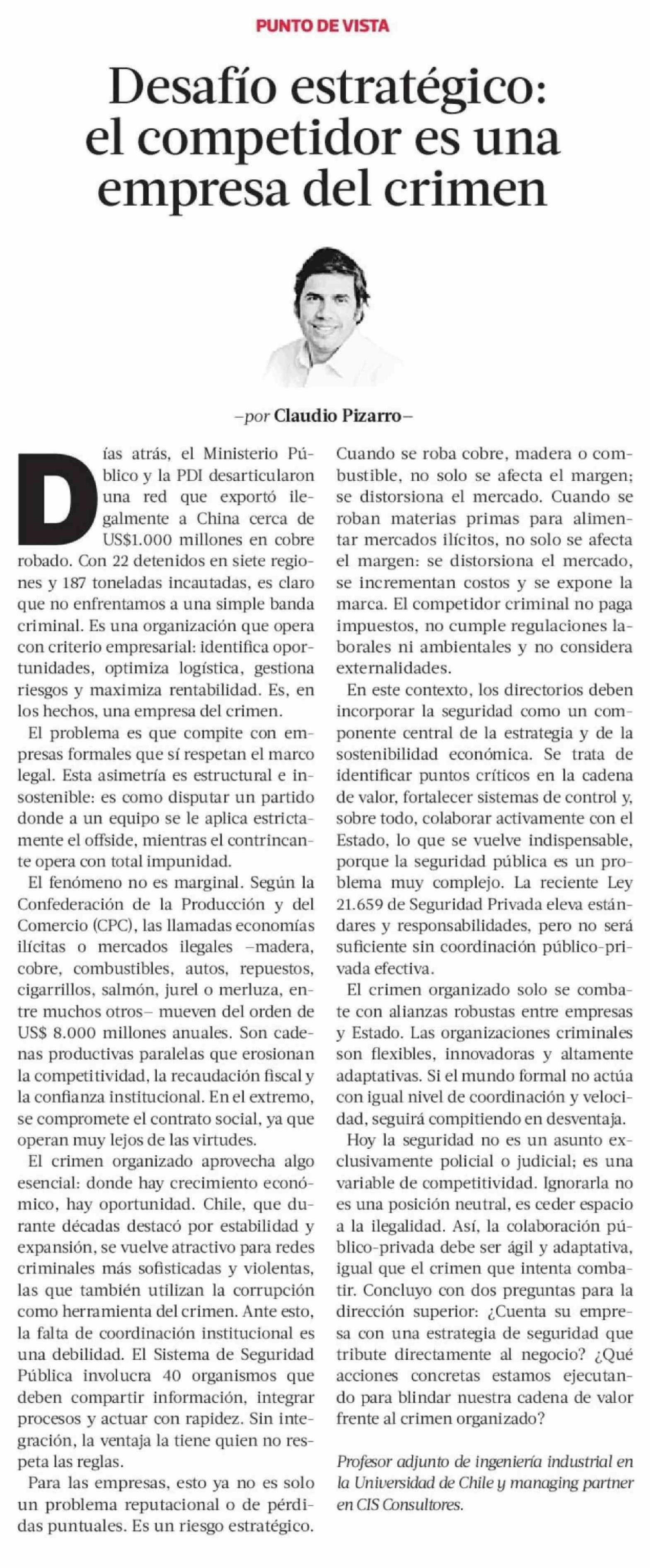 Columnas de Opinión: Desafío estratégico: el competidor es una empresa del crimen 22-04-2026 La Tercera |