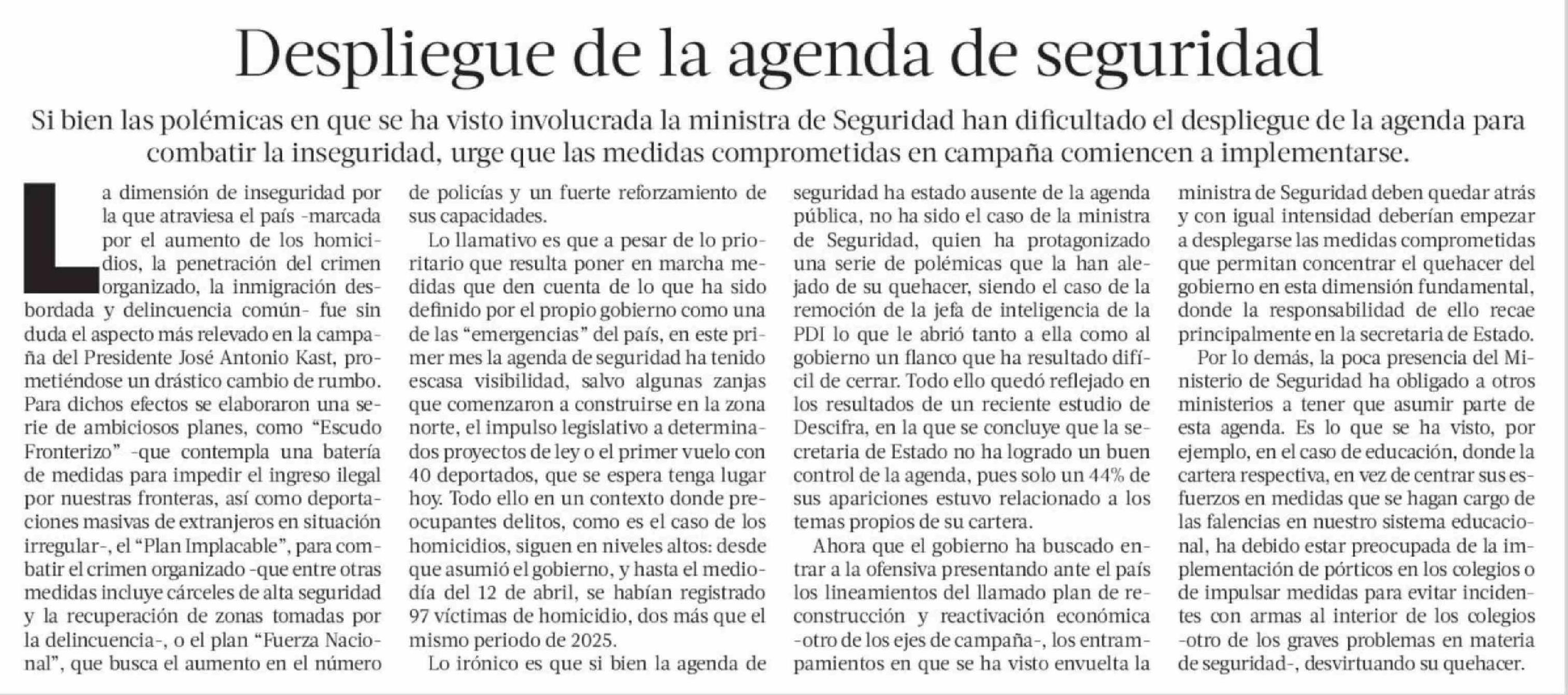 Editorial: Despliegue de la agenda de seguridad 16-04-2026 La Tercera |