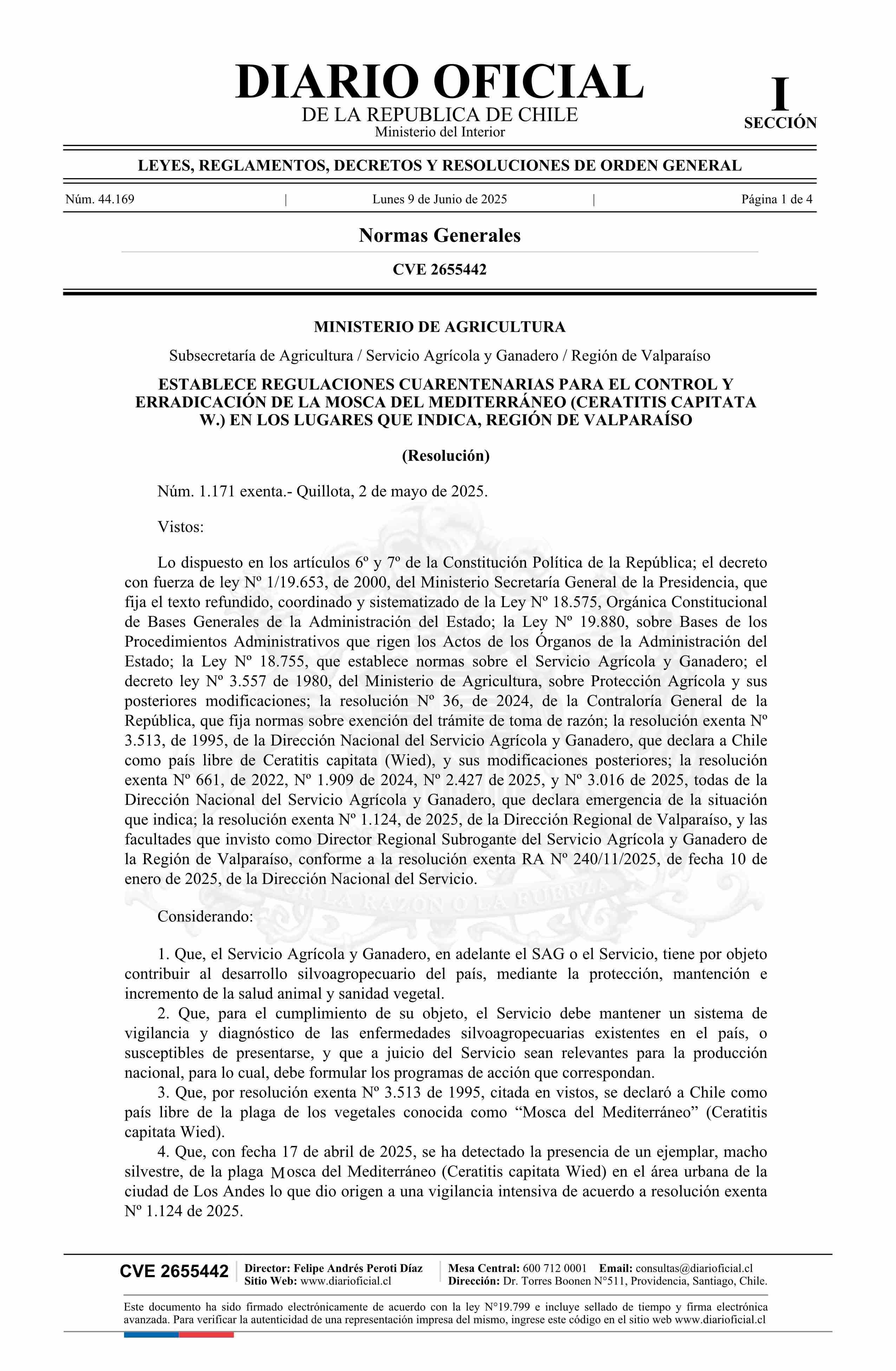Resolución exenta número 1.171, de 2025.- Establece regulaciones cuarentenarias para el control y erradicación de la Mosca del Mediterráneo (Ceratitis capitata W.) en los lugares que indica 09-06-2025 DIARIO OFICIAL CHILE - BOLETÍN OFICIAL DE MINERÍA |