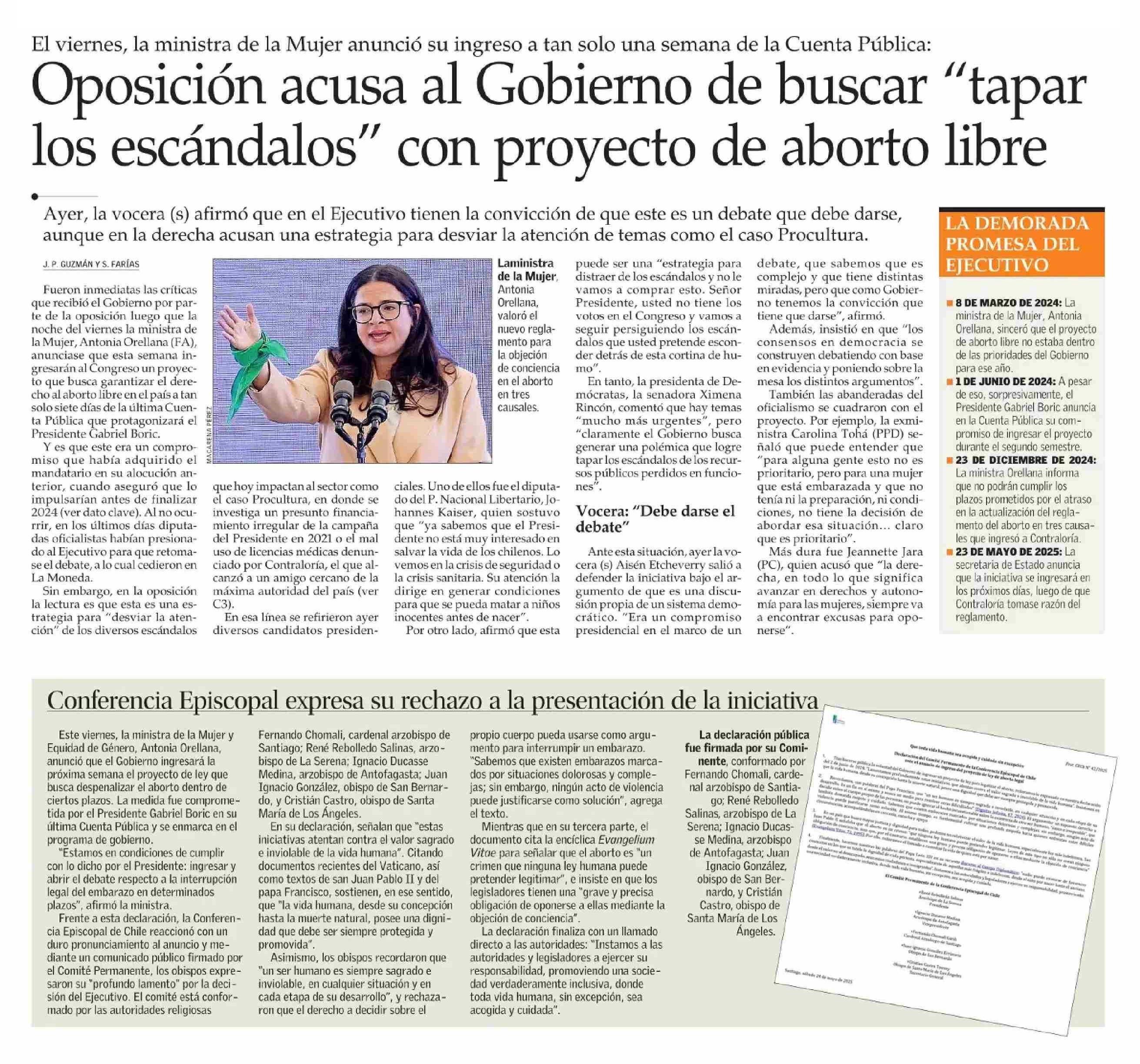 Oposición acusa al Gobierno de buscar "tapar los escándalos" con proyecto de aborto libre 25-05-2025 El Mercurio |