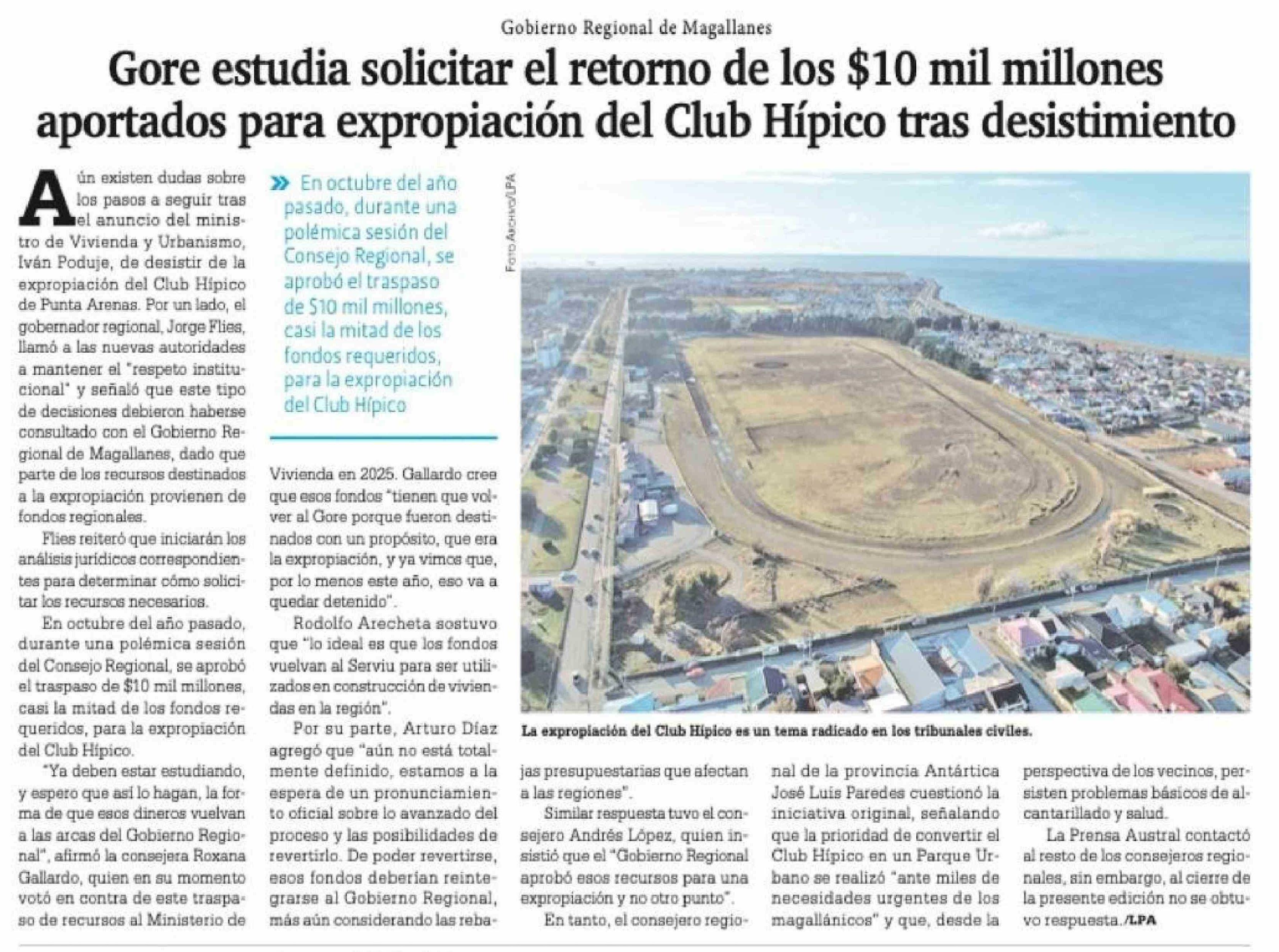 Gore estudia solicitar el retorno de los $10 mil millones aportados para expropiación del Club Hípico tras desistimiento 02-04-2026 La Prensa Austral |