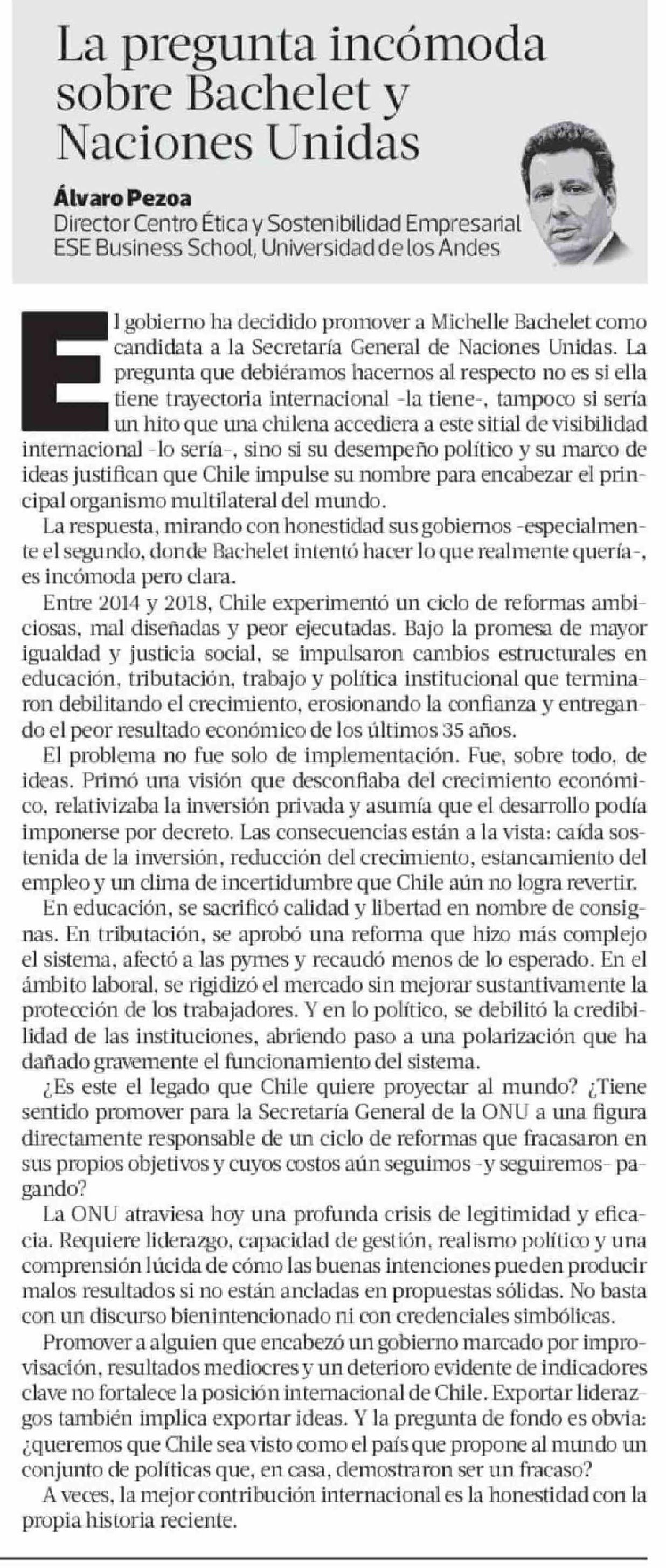 Título: Columnas de Opinión: La pregunta incómoda sobre Bachelet y Naciones Unidas