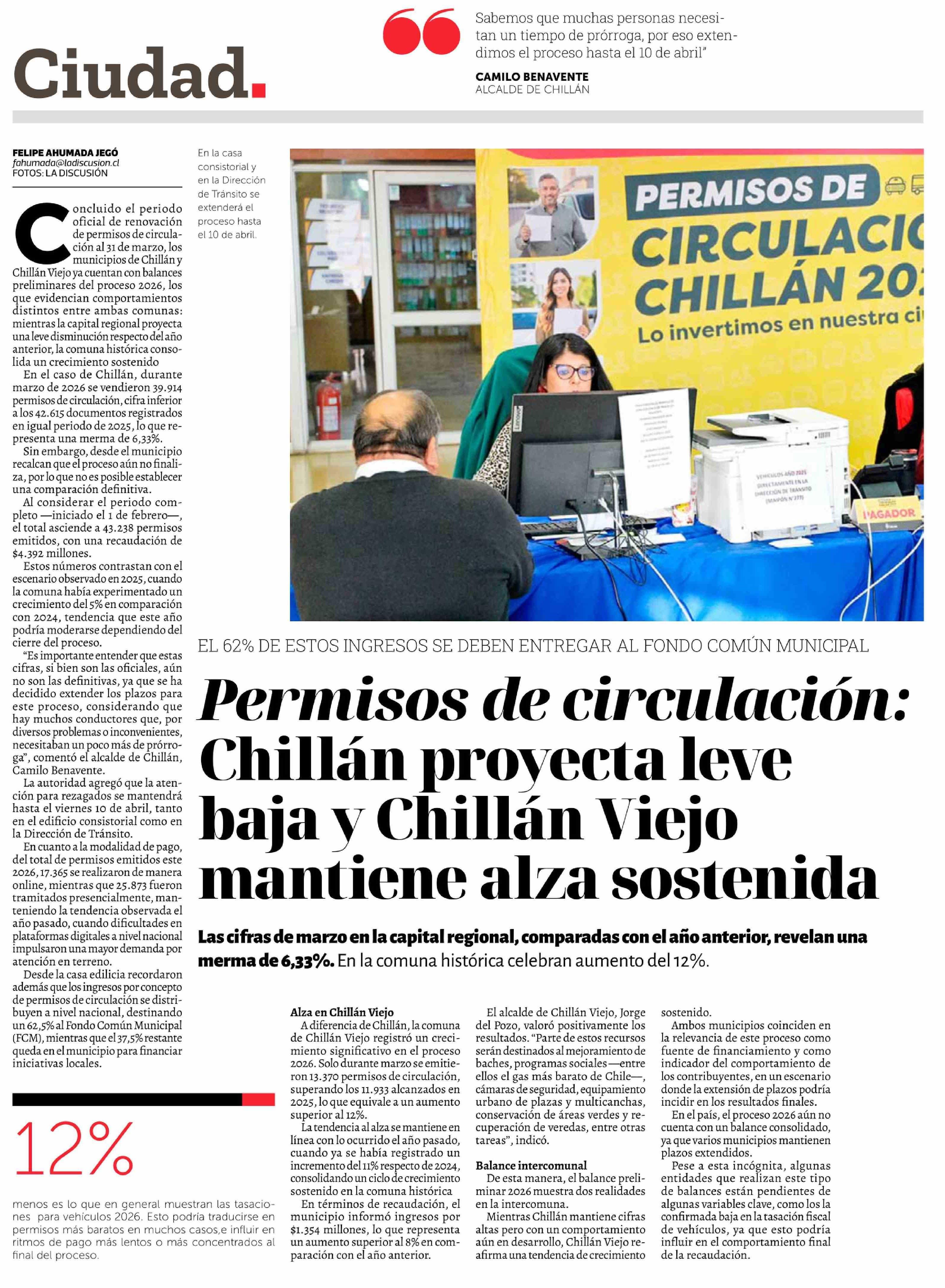 Permisos de circulación: Chillán proyecta leve baja y Chillán Viejo mantiene alza sostenida 02-04-2026 La Discusión |