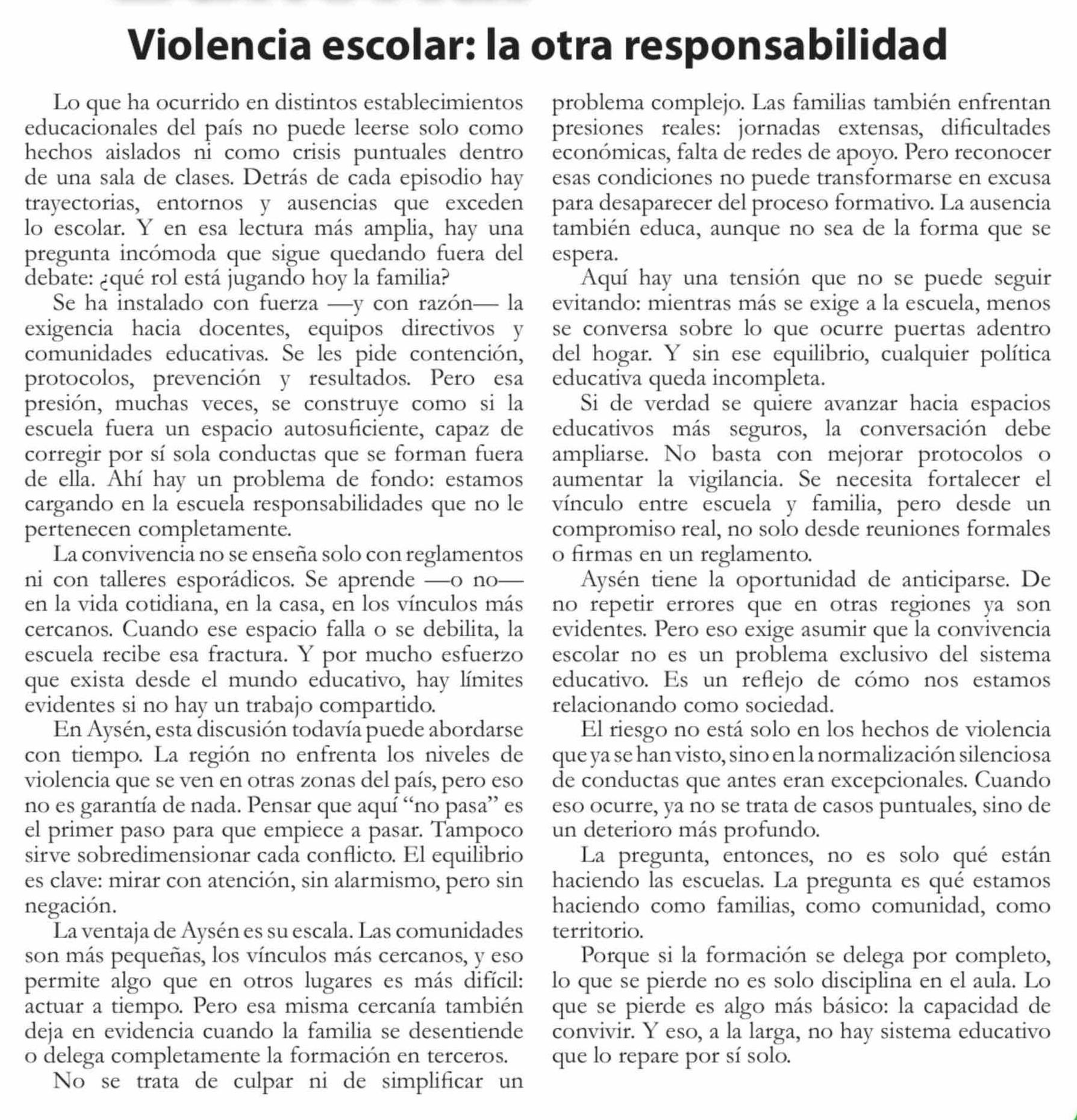 Fecha: 16-04-2026 Sector: Editorial Región: Región Aysén del General Carlos Ibáñez del Campo