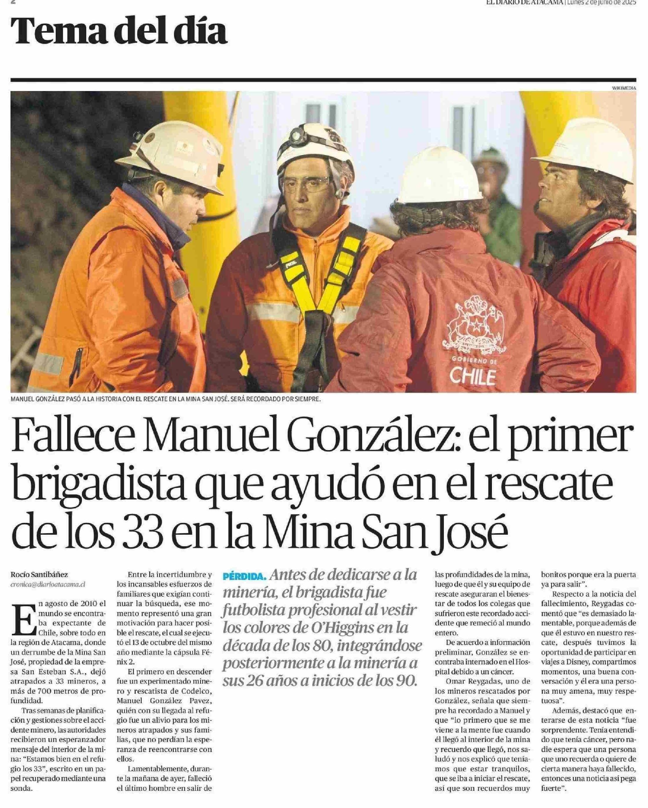 Fallece Manuel González: el primer rigadista que ayudó en el rescate de los 33 en la Mina San José 02-06-2025 El Diario de Atacama |